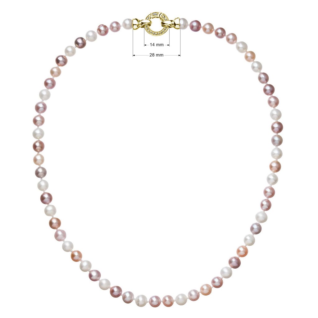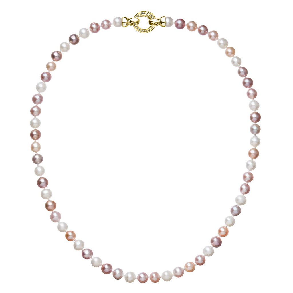 Perlový náhrdelník 22004.3 o celkovej dĺžke 45 cm sa skladá z pravých riečnych perál v rôznych farbách jemných tónov. Každá perla je zaistená uzlíkovou väzbou , a tak sa pri nechcenom pretrhnutí náhrdelníka nestane, že sa vám perly rozkotúľajú na všetky strany. Zaujímavo riešené okrúhle pozlátené strieborné zapínanie zdobené niekoľkými trblietavými zirkónmi dodáva náhrdelníku na elegancii. Striebro použité na zapínanie má rýdzosť 925/1000. Náhrdelník neobsahuje nikel, a tak ho môžu bez obáv nosiť aj alergici.