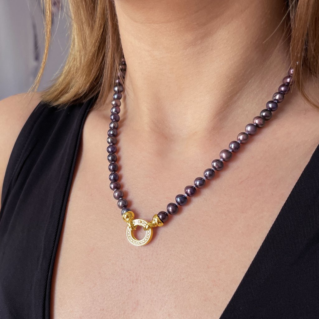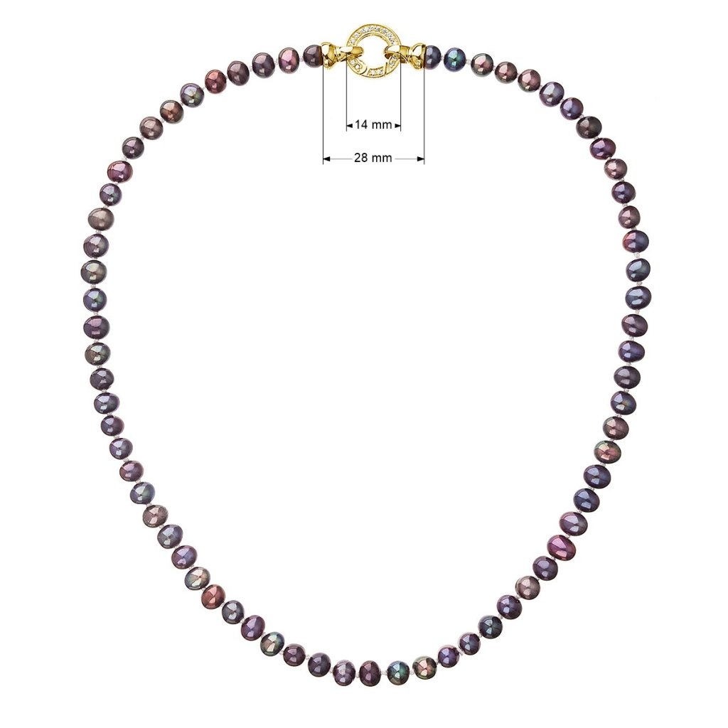S perlovým náhrdelníkom v tmavých odtieňoch modrofialovej, celkom iste zapôsobíte! Náhrdelník je jemný a skvele sa hodí na každú slávnostnú udalosť!Perlový náhrdelník 22001.3 o celkovej dĺžke 45 cm sa skladá z oválnych pravých riečnych perál v tmavo modrofialovej farbe . Každá perla je zaistená uzlíkovou väzbou , a tak sa pri nechcenom pretrhnutí náhrdelníka nestane, že sa vám perly rozkotúľajú na všetky strany. Zaujímavo riešené okrúhle pozlátené strieborné zapínanie zdobené niekoľkými trblietavými zirkónmi dodáva náhrdelníku na elegancii. Striebro použité na zapínanie má rýdzosť 925/1000 a je pozlátené. Náhrdelník neobsahuje nikel, a tak ho môžu bez obáv nosiť aj alergici.