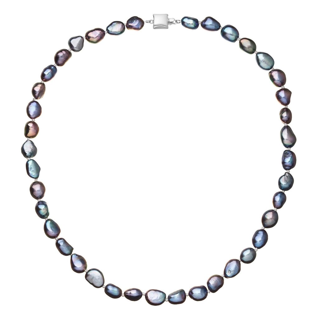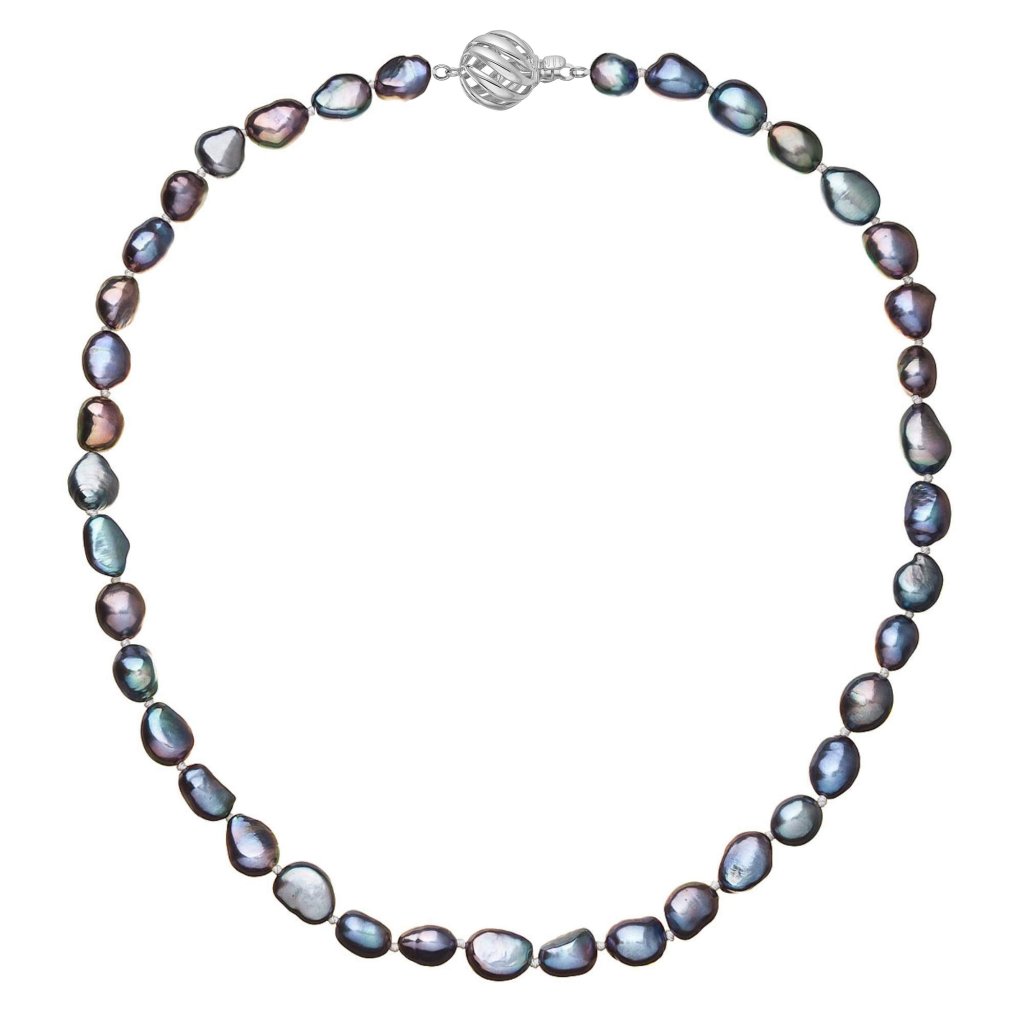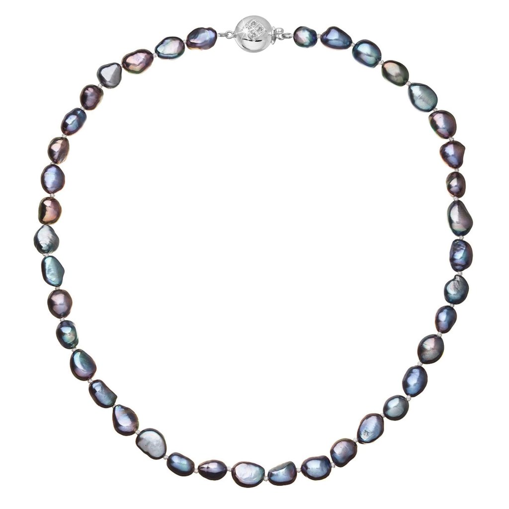 S náhrdelníkom z pravých sladkovodných kultivovaných riečnych perál budete v spoločnosti očarujúce! Jedinečný perlový náhrdelník 822027.3 doplnený o zlaté 14 karátové zapínanie bude vo Vašom dekolte neprehliadnuteľný. Náhrdelník je navlečený z pravých modrofialových peacock riečnych perál kvality A a je zaistený uzlíkovou väzbou, ktorá zabraňuje posúvaniu a poškodeniu perál trením o seba a rovnako chráni perly pred rozsypaním, pokiaľ sa náhrdelník náhodou pretrhne.