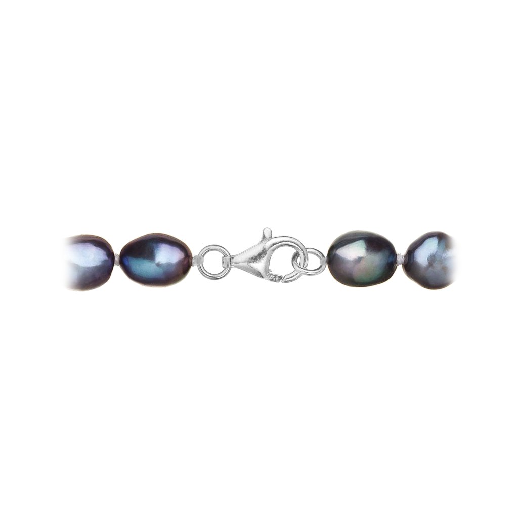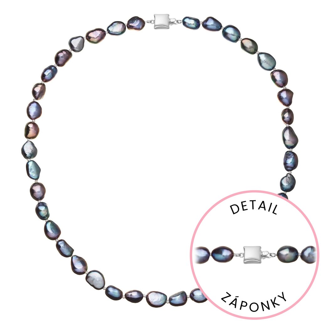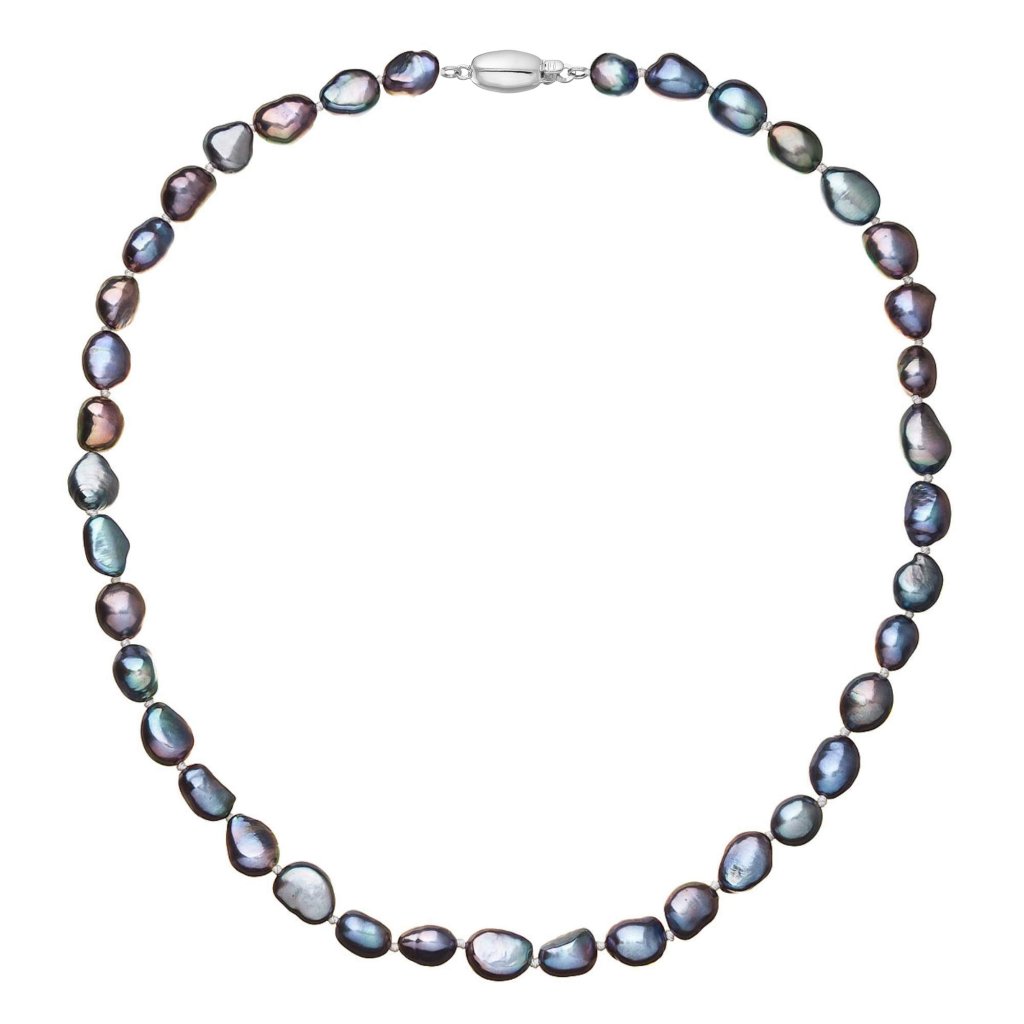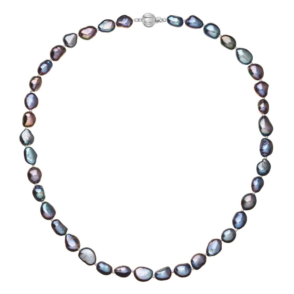 S náhrdelníkom z pravých sladkovodných kultivovaných riečnych perál budete v spoločnosti očarujúce! Jedinečný perlový náhrdelník 822027.3 doplnený o zlaté 14 karátové zapínanie bude vo Vašom dekolte neprehliadnuteľný. Náhrdelník je navlečený z pravých modrofialových peacock riečnych perál kvality A a je zaistený uzlíkovou väzbou, ktorá zabraňuje posúvaniu a poškodeniu perál trením o seba a rovnako chráni perly pred rozsypaním, pokiaľ sa náhrdelník náhodou pretrhne.