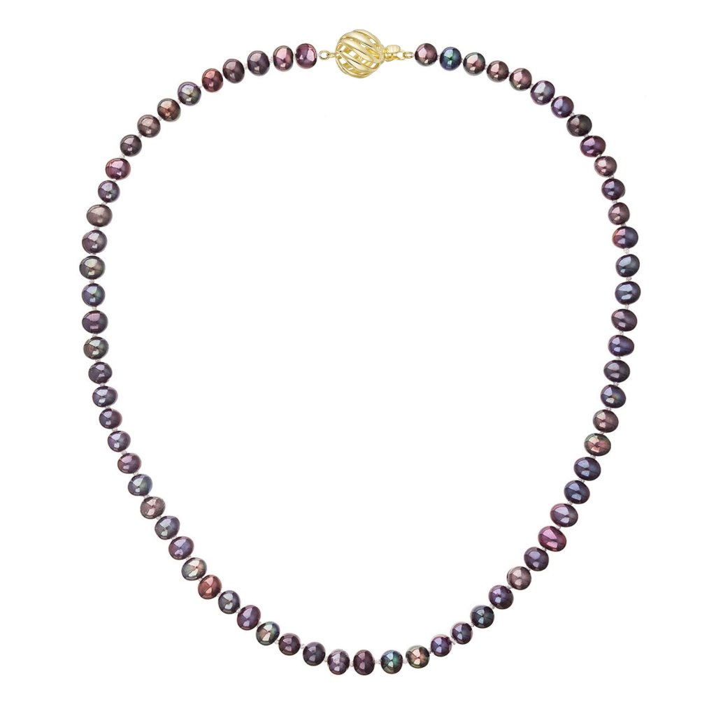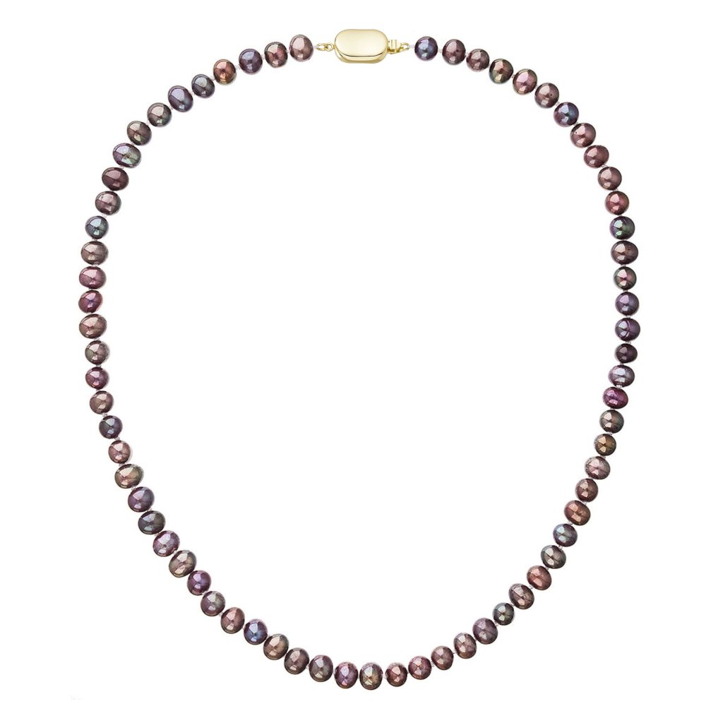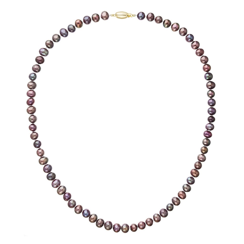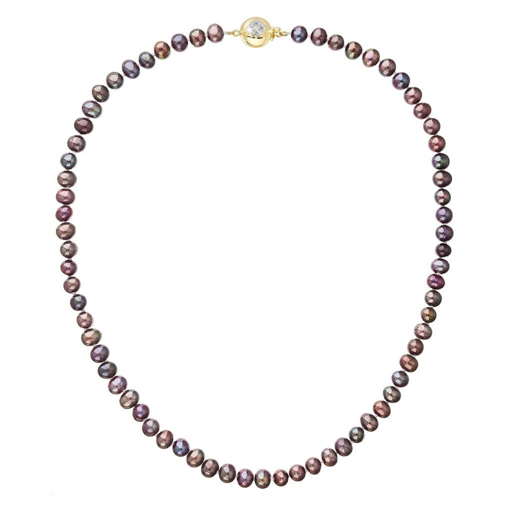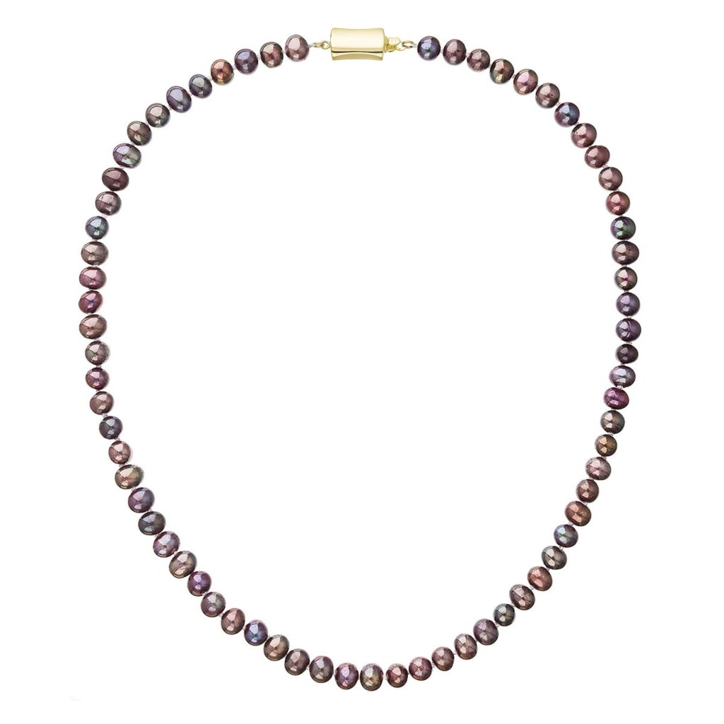 S náhrdelníkom z pravých sladkovodných kultivovaných riečnych perál budete v spoločnosti očarujúce! Jedinečný perlový náhrdelník 922001.3 doplnený o zlaté 14 karátové zapínanie bude vo Vašom dekolte neprehliadnuteľný. Náhrdelník je navlečený z pravých riečnych perál dark peacock, vysokej kvality B a je zaistený uzlíkovou väzbou, ktorá zabraňuje posúvaniu a poškodeniu perál trením o seba a rovnako chráni perly pred rozsypaním, pokiaľ sa náhrdelník náhodou pretrhne.