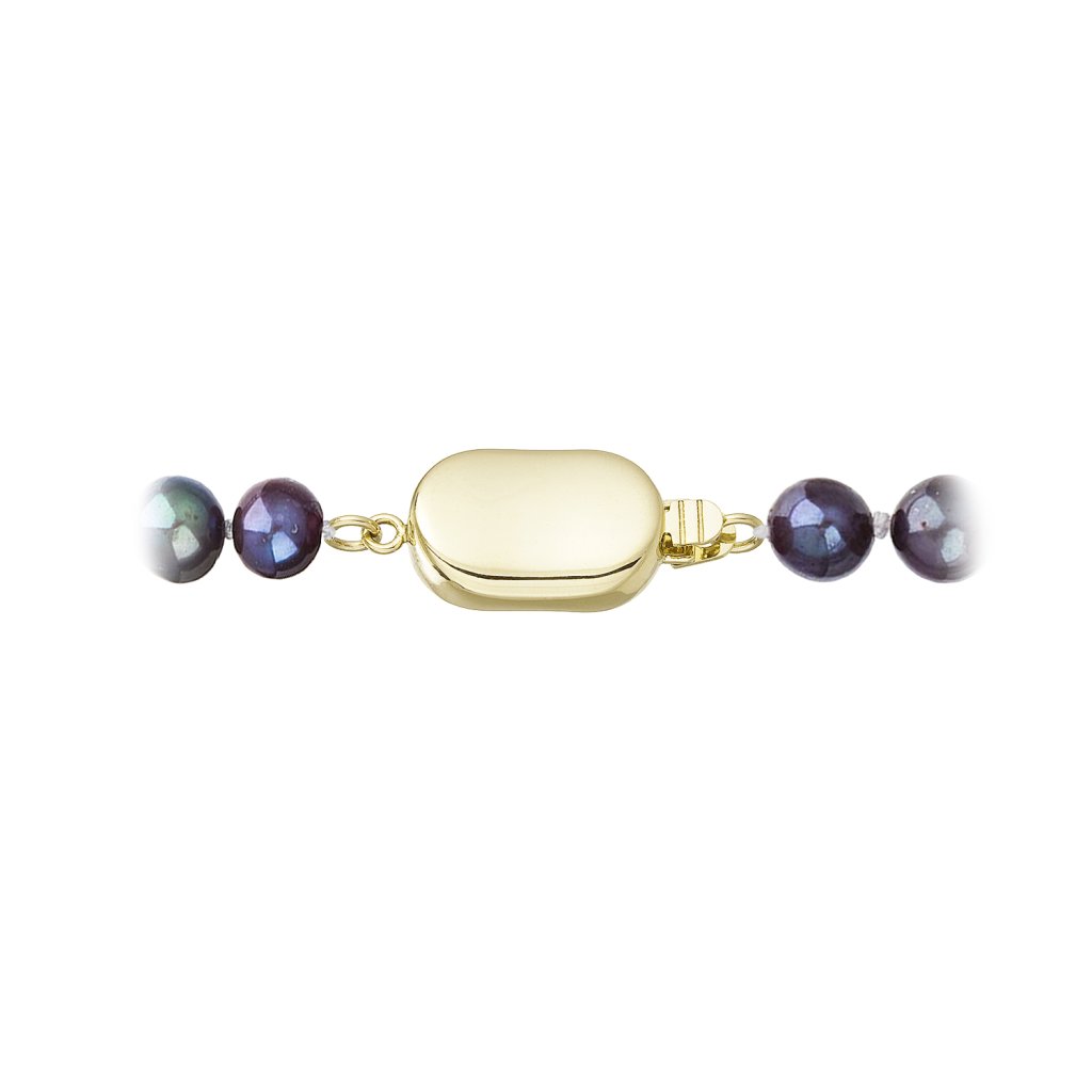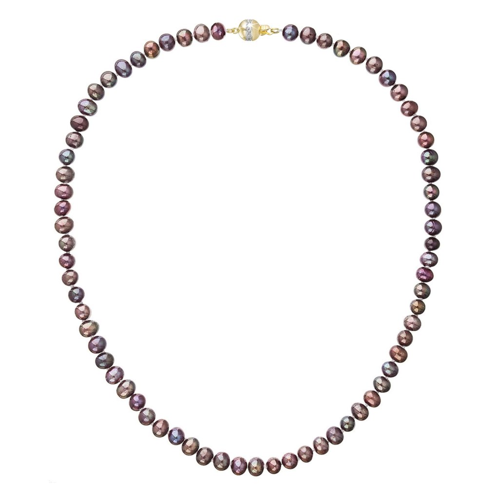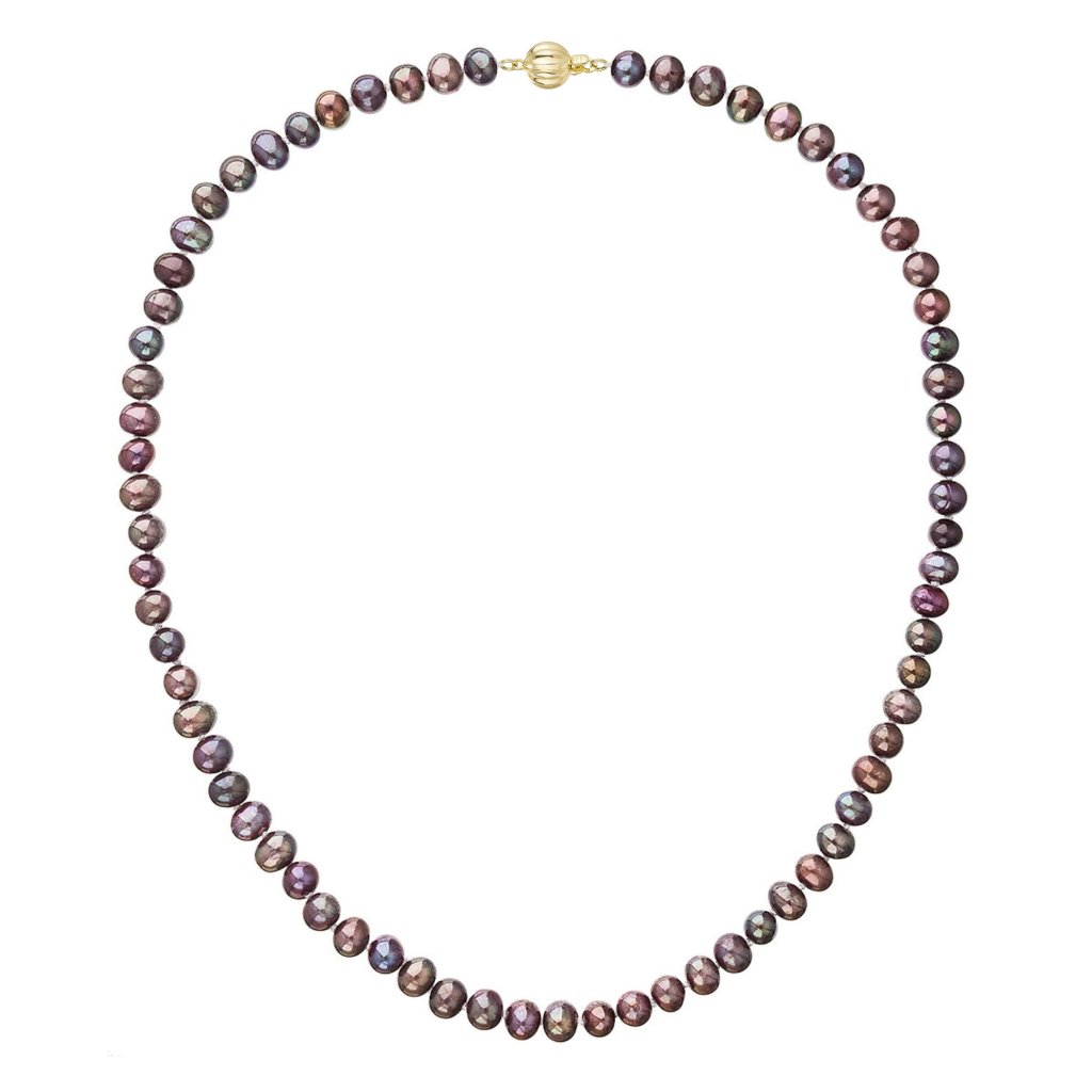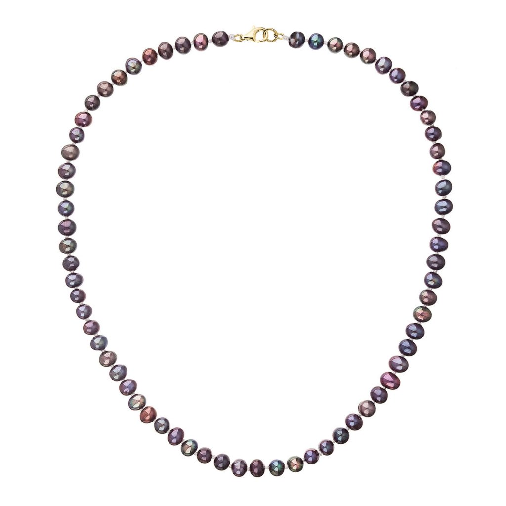 S náhrdelníkom z pravých sladkovodných kultivovaných riečnych perál budete v spoločnosti očarujúce! Jedinečný perlový náhrdelník 922001.3 doplnený o zlaté 14 karátové zapínanie bude vo Vašom dekolte neprehliadnuteľný. Náhrdelník je navlečený z pravých riečnych perál dark peacock, vysokej kvality B a je zaistený uzlíkovou väzbou, ktorá zabraňuje posúvaniu a poškodeniu perál trením o seba a rovnako chráni perly pred rozsypaním, pokiaľ sa náhrdelník náhodou pretrhne.