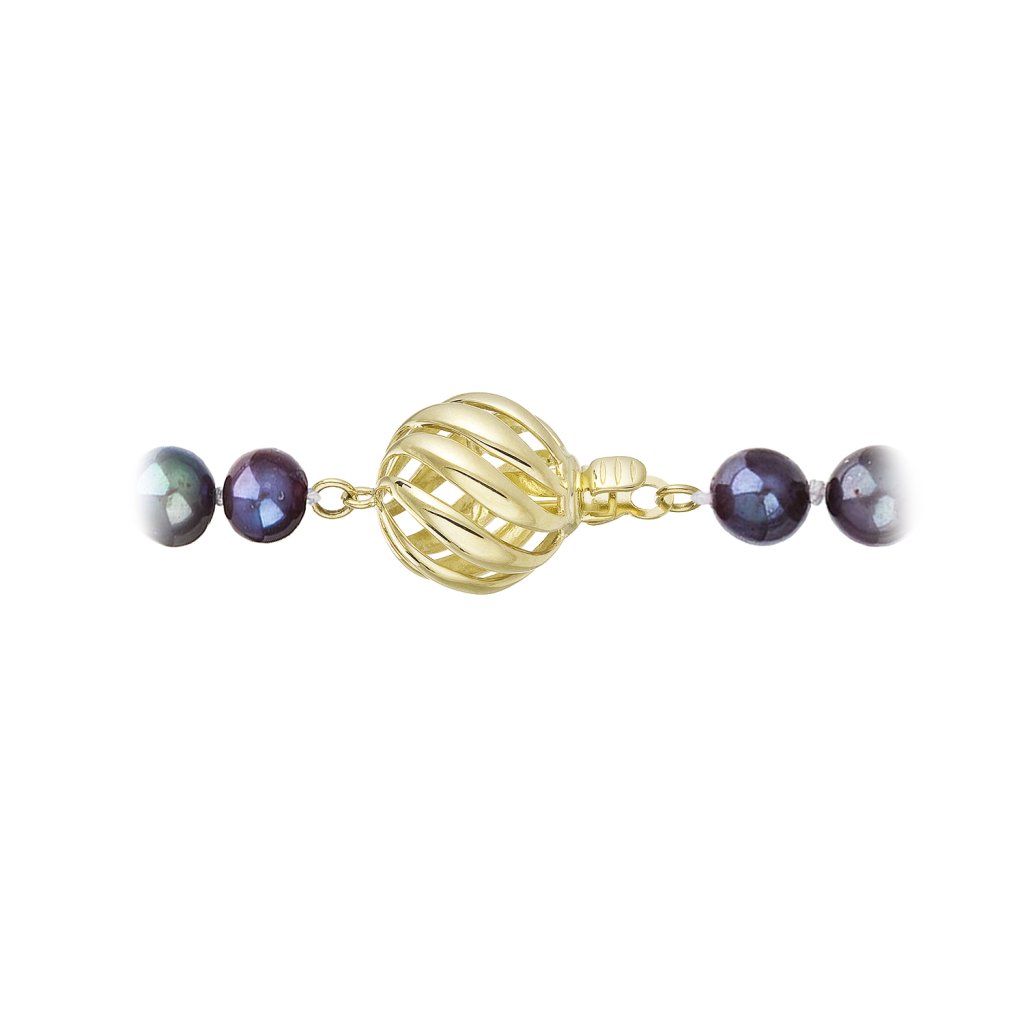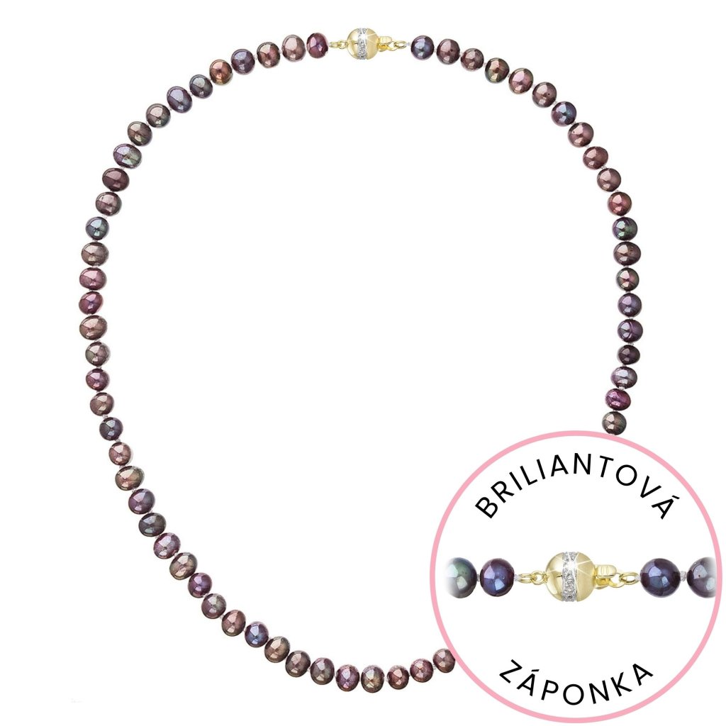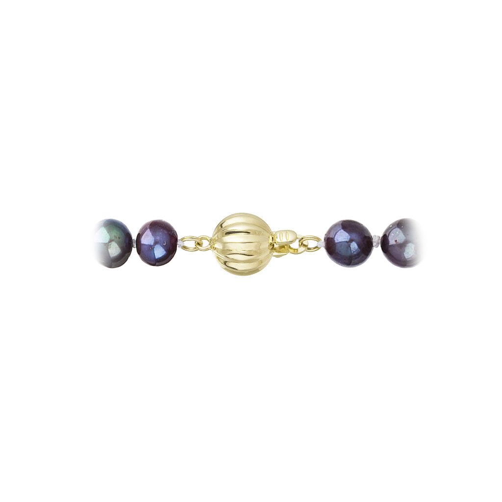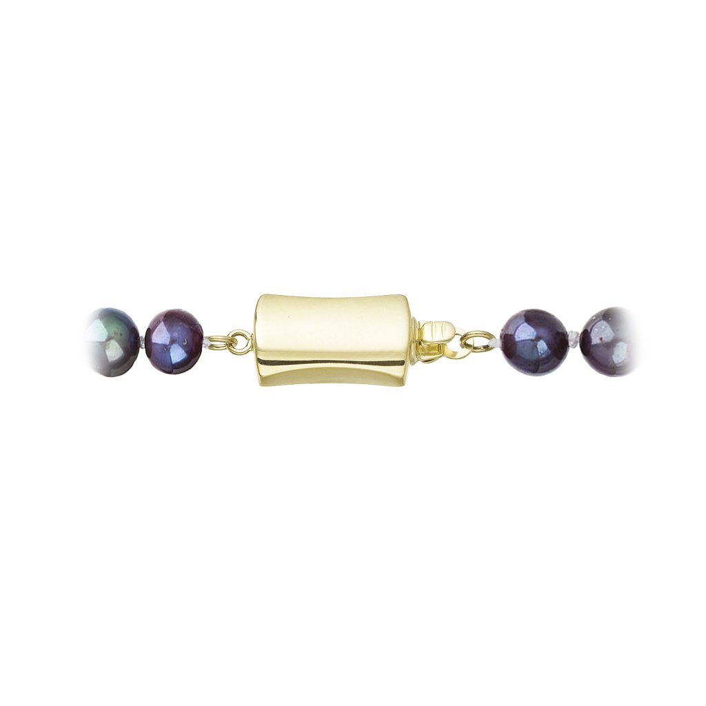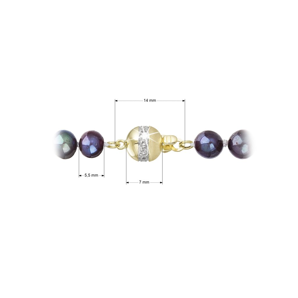S náhrdelníkom z pravých sladkovodných kultivovaných riečnych perál budete v spoločnosti očarujúce! Jedinečný perlový náhrdelník 922001.3 doplnený o zlaté 14 karátové zapínanie bude vo Vašom dekolte neprehliadnuteľný. Náhrdelník je navlečený z pravých riečnych perál dark peacock, vysokej kvality B a je zaistený uzlíkovou väzbou, ktorá zabraňuje posúvaniu a poškodeniu perál trením o seba a rovnako chráni perly pred rozsypaním, pokiaľ sa náhrdelník náhodou pretrhne.