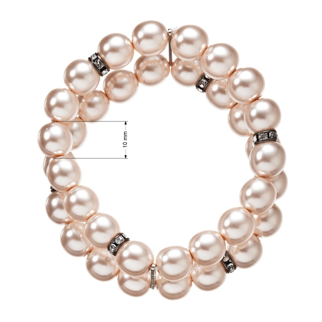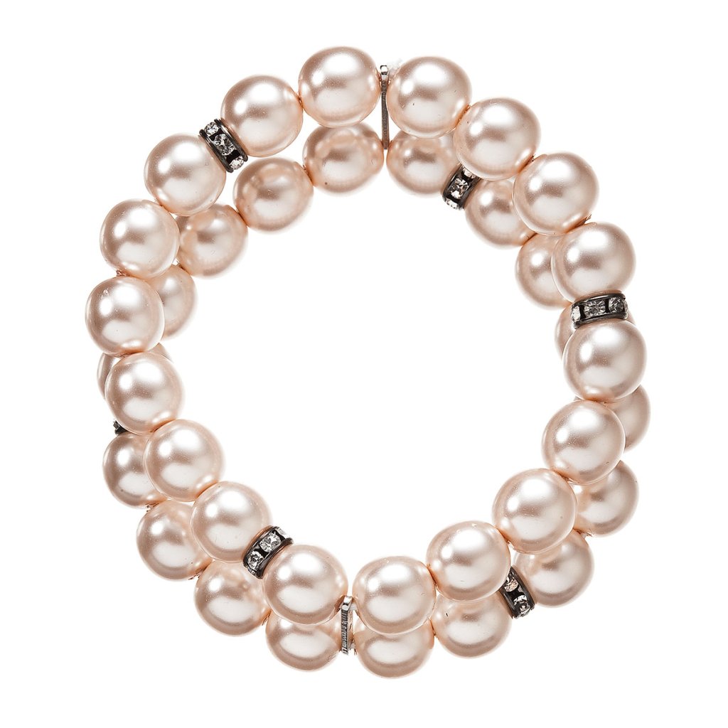 Nežná krása vašich rúk vynikne vďaka d vúradému náramku z ružových perál!Dvojradový náramok 33065.3 je z ružových syntetických perál medzi ktoré sú vložené metal rondelky vysadené kryštálmi . Kryštály sú v bielej farbe. Oba náramky sú spojené jemným strieborným komponentom. Dĺžka náramku je 17,5 cm, je pružného materiálu a tak sa prispôsobí veľkosti zápästia. Na rondelky bol použitý bižutérny kov, ktorého povrch prešiel úpravou ródiom.