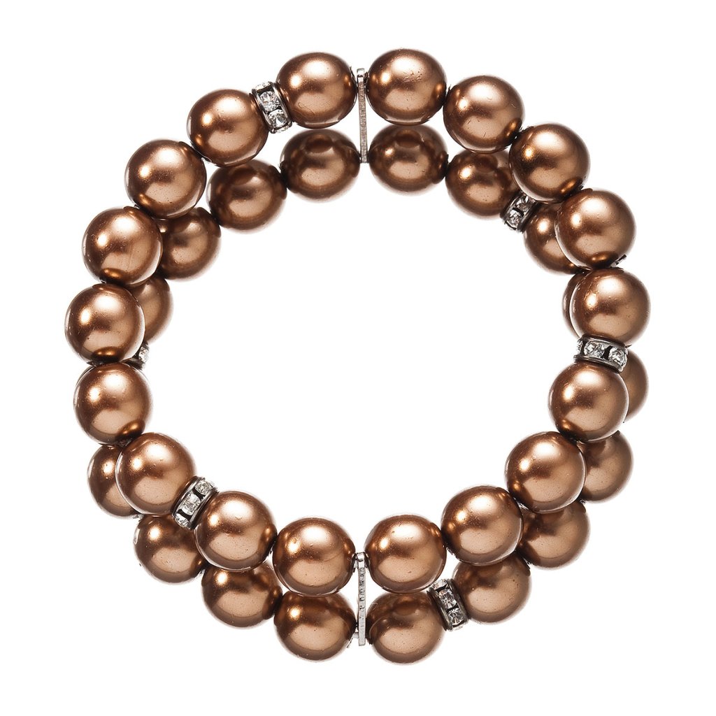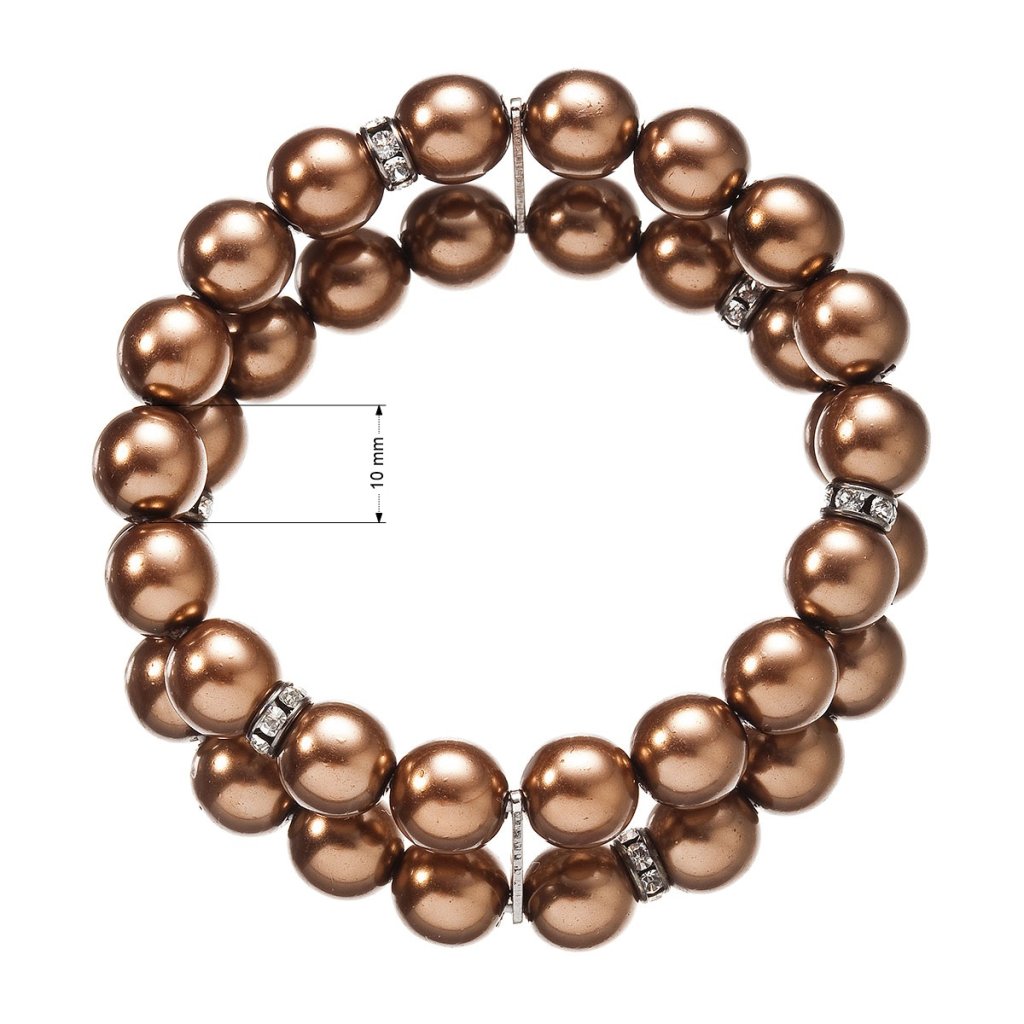 Chystáte sa na ples alebo na inú výnimočnú udalosť? Ozdobte sa elegantným dvojradovým náramkom z bronzových perál!Dvojradový náramok 33065.3 je z hnedých-bronzových syntetických perál medzi ktoré sú vložené metal rondelky vysadené kryštálmi . Kryštály sú v bielej farbe. Oba náramky sú spojené jemným strieborným komponentom. Dĺžka náramku je 17,5 cm, je pružného materiálu a tak sa prispôsobí veľkosti zápästia. Na rondelky bol použitý bižutérny kov, ktorého povrch prešiel úpravou ródiom.