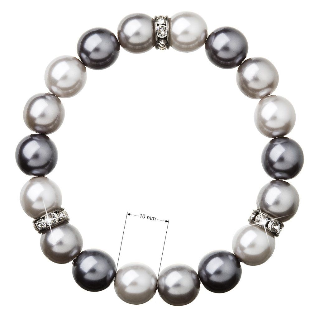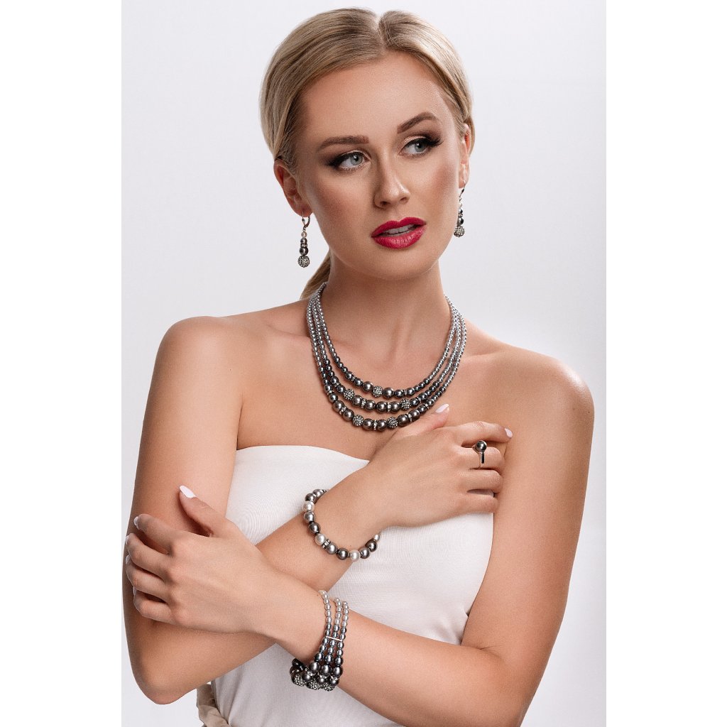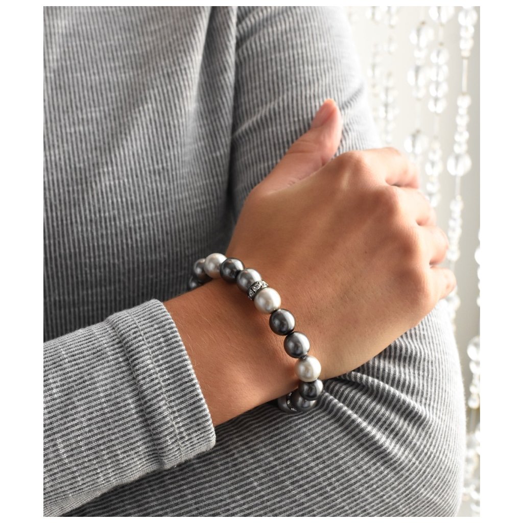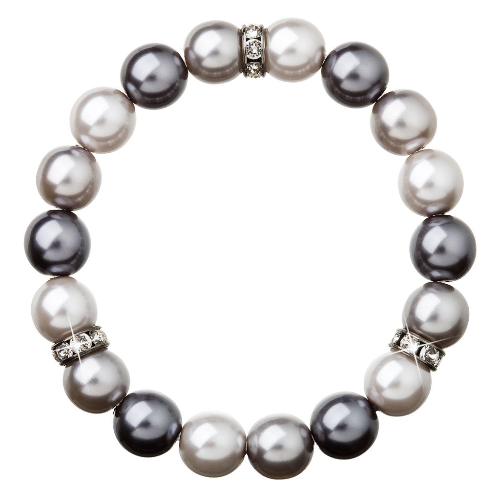 Doplňte svoj outfit perlovým náramkom v šedej farbe , ktorý krásne ozdobí vaše zápästie.Náramok 33061.3 je navlečený z okrúhlych šedých perál, medzi ktoré sú vložené tri okrúhle rondelky vysadené Swarovski kryštálmi . Kryštály sú v bielej farbe. Na rondelky bol použitý bižutérny kov, ktorého povrch prešiel úpravou ródiom. Rhodium šperk chráni proti sčerneniu, zožltnutiu alebo poškriabaniu. Keďže náramok neobsahuje prídavok niklu , môžu ho bez obáv z alergickej reakcie nosiť aj alergici.
