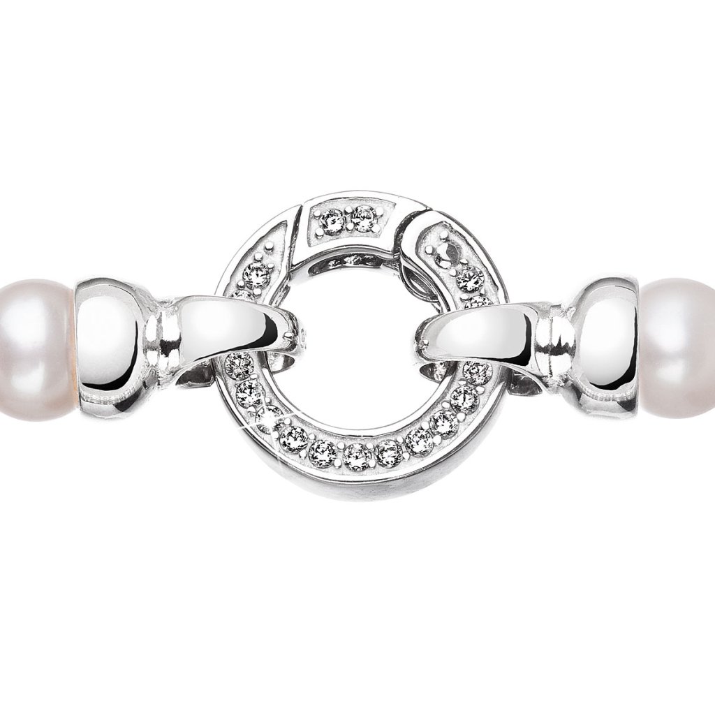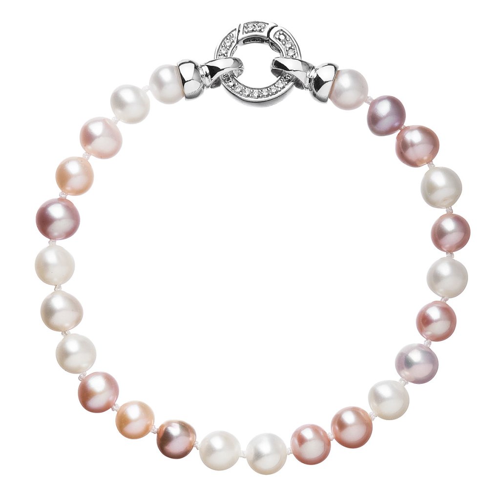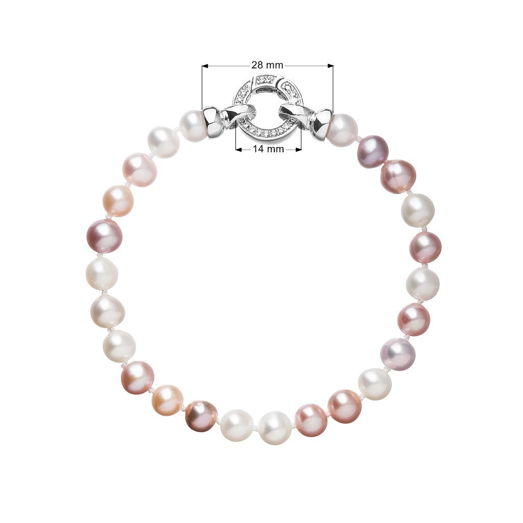 Ak vyrážate na ples v čiernych koktailkách, rozjasnite ich aspoň hravým farebným šperkom. Čo napríklad klasický perlový náramok 23004.3 s perlami v odtieňoch bielej, béžovej, marhuľovej a ružovej?Perlový náramok s dĺžkou 19,5 cm je zložený z celkom 24 oválnych riečnych perál veľkosti 7,5 - 8 mm v rôznych farbách jemných tónov. Každá perla je zaistená uzlíkovou väzbou , a tak sa pri nechcenom pretrhnutí náramku nestane, že sa vám perly rozkotúľajú na všetky strany. Zaujímavo riešené okrúhle strieborné zapínanie zdobené niekoľkými trblietavými zirkónmi dodáva náramku na elegancii. Striebro použité na zapínanie má rýdzosť 925/1000 a ródiovú povrchovú úpravu. Náramok neobsahuje nikel , a tak ho môžu bez obáv nosiť aj alergici.