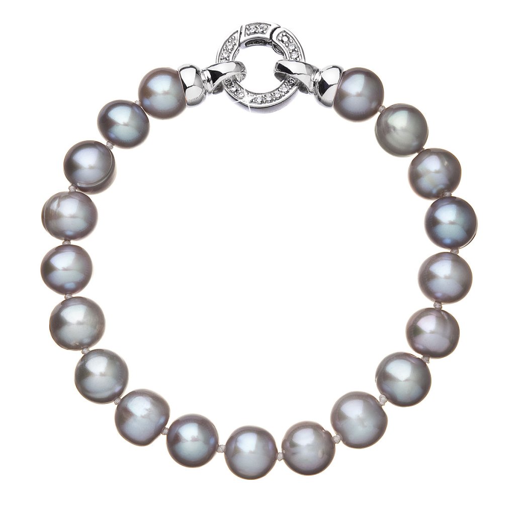 Jedinečný perlový náramok z pravých riečnych perál v šedej farbe perfektne doladí váš elegantný outfit.Perlový náramok 23010.3 o dĺžke 19,5 cm je zložený z celkom 19 takmer okrúhlych riečnych perál veľkosti 8 - 8,5 mm v šedej farbe. Každá perla je zaistená uzlíkovou väzbou , a tak sa pri nechcenom pretrhnutí náramku nestane, že sa vám perly rozkotúľajú na všetky strany. Zaujímavo riešené okrúhle strieborné zapínanie zdobené niekoľkými trblietavými zirkónmi dodáva náramku na elegancii. Striebro použité na zapínanie má rýdzosť 925/1000 a ródiovú povrchovú úpravu. Náramok neobsahuje nikel , a tak ho môžu bez obáv nosiť aj alergici.