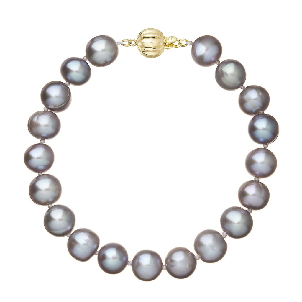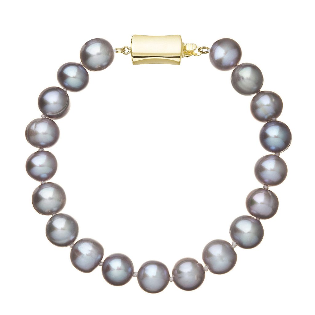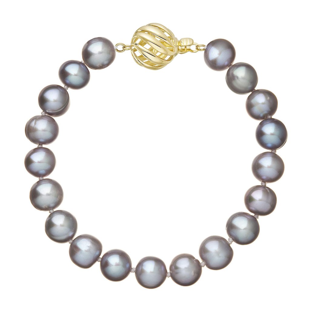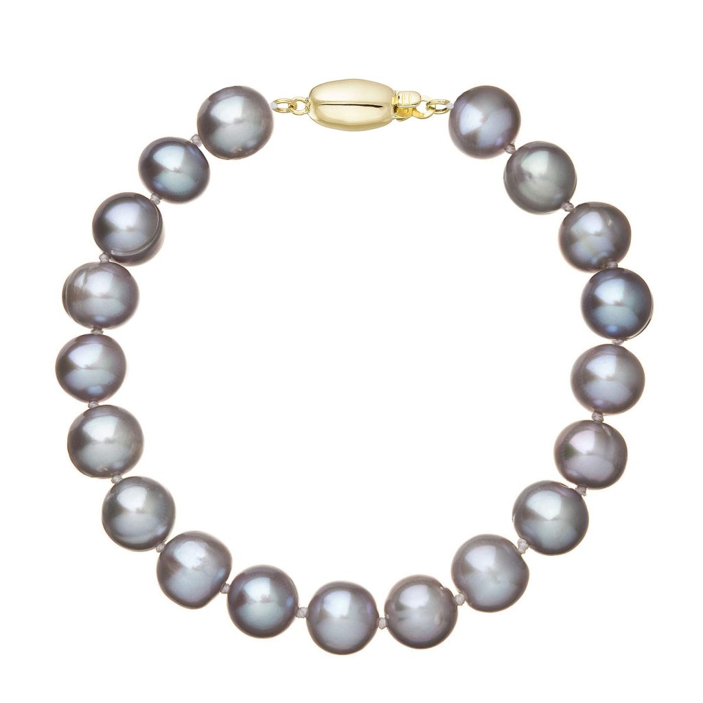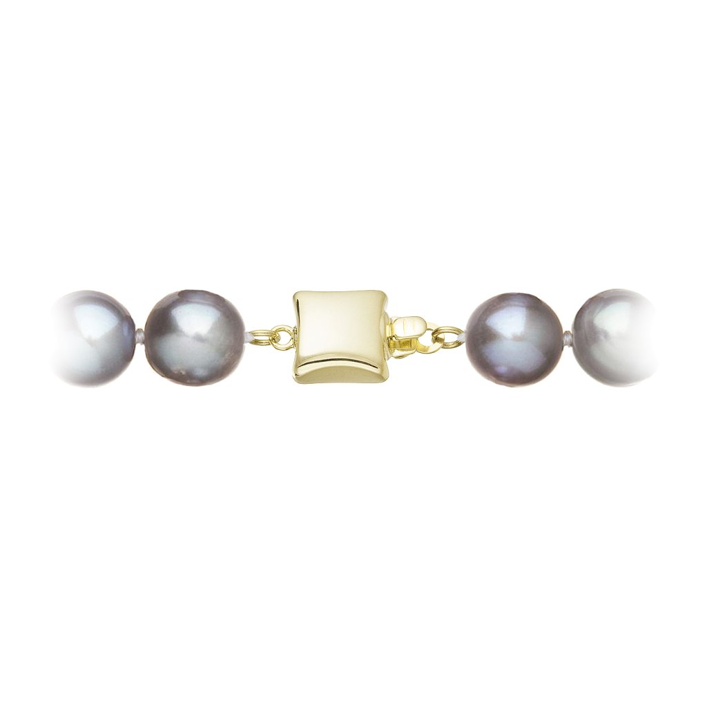 S náramkom z pravých sladkovodných kultivovaných riečnych perál budete v spoločnosti očarujúce! Jedinečný perlový náramok 923010.3 doplnený o zlaté 14 karátové zapínanie bude neprehliadnuteľný. Náramok je navlečený z okrúhlych pravých riečnych perál v šedých odtieňoch, kvality A a je zaistený uzlíkovou väzbou, ktorá zabraňuje posúvaniu a poškodeniu perál trením o seba a rovnako chráni perly pred rozsypaním, pokiaľ sa náramok náhodou pretrhne.