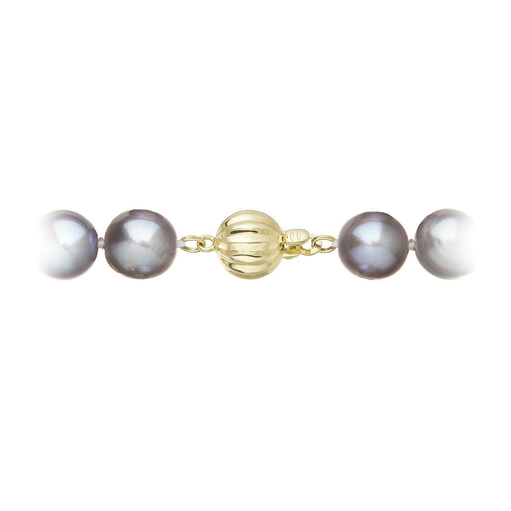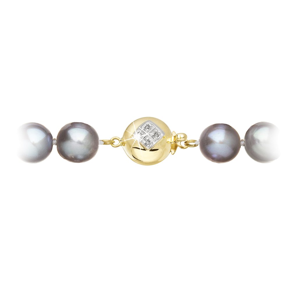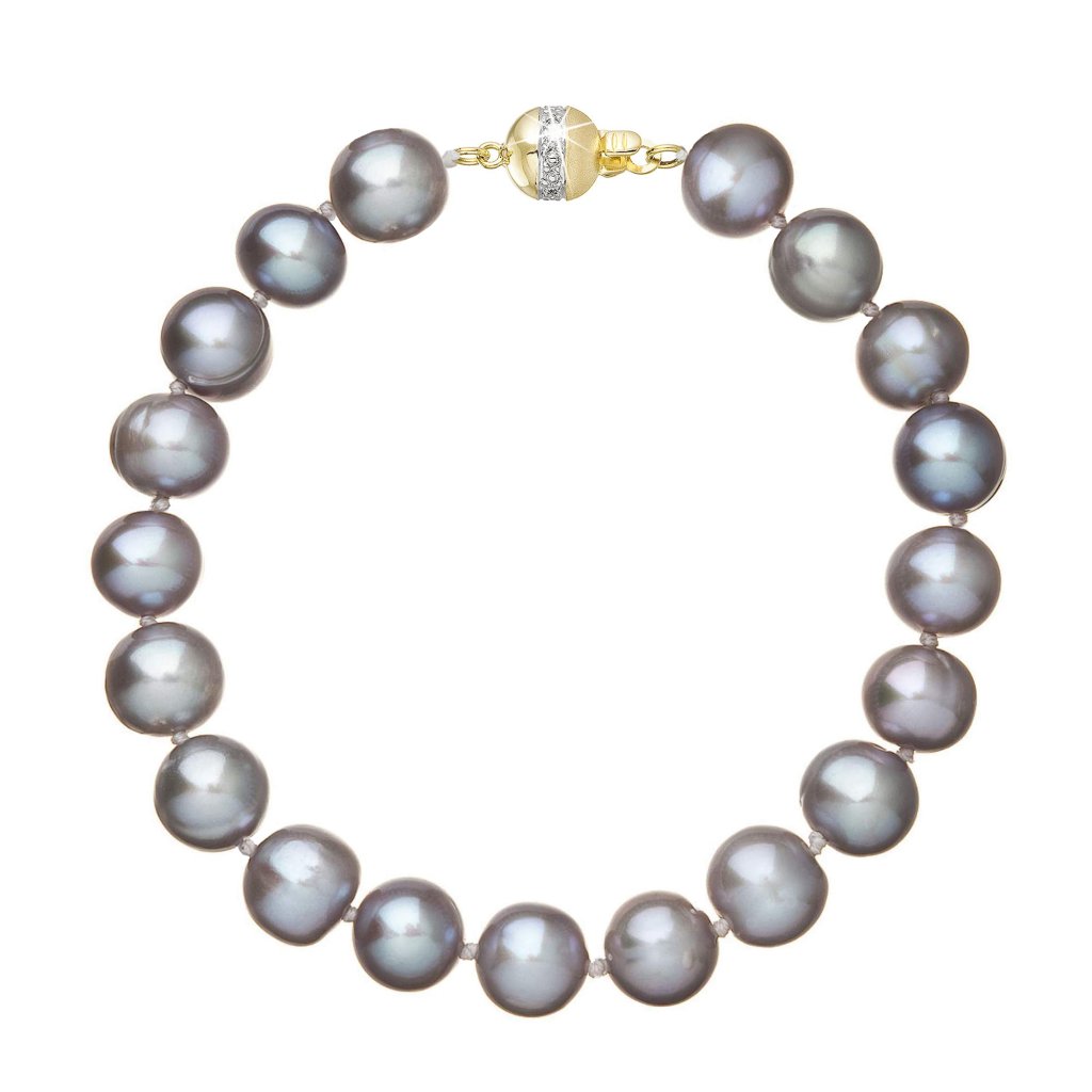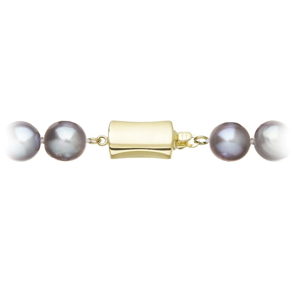 S náramkom z pravých sladkovodných kultivovaných riečnych perál budete v spoločnosti očarujúce! Jedinečný perlový náramok 923010.3 doplnený o zlaté 14 karátové zapínanie bude neprehliadnuteľný. Náramok je navlečený z okrúhlych pravých riečnych perál v šedých odtieňoch, kvality A a je zaistený uzlíkovou väzbou, ktorá zabraňuje posúvaniu a poškodeniu perál trením o seba a rovnako chráni perly pred rozsypaním, pokiaľ sa náramok náhodou pretrhne.