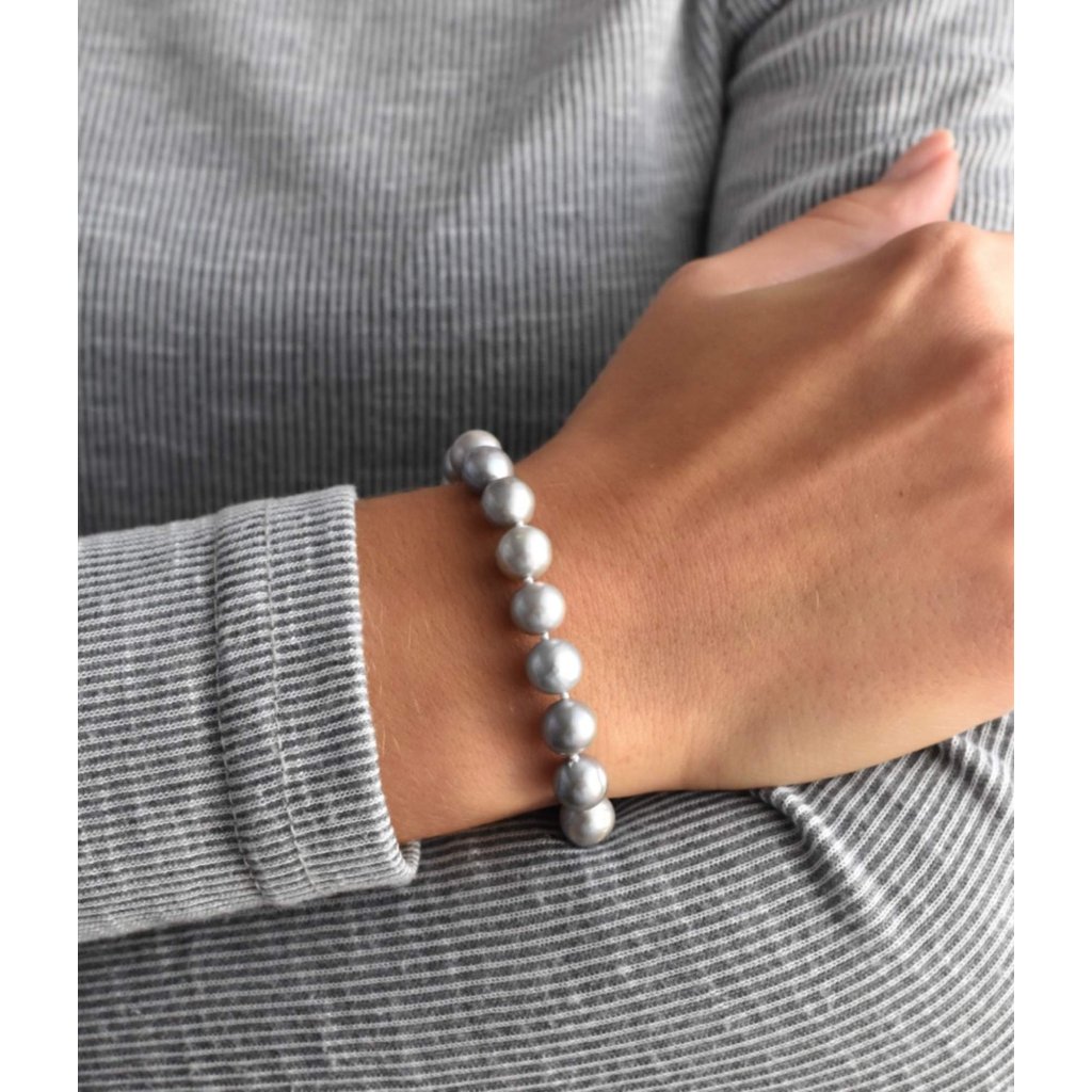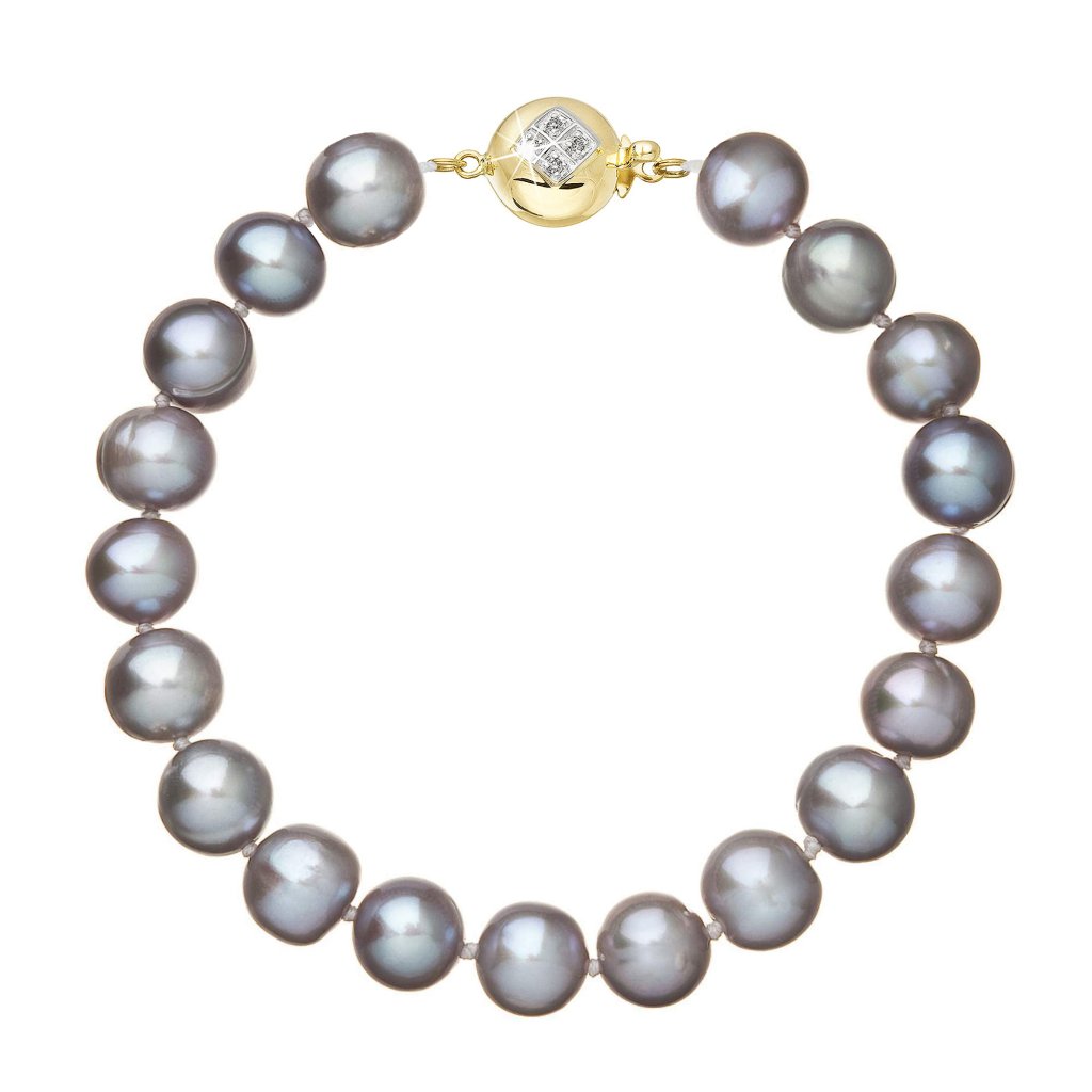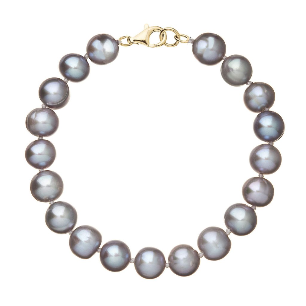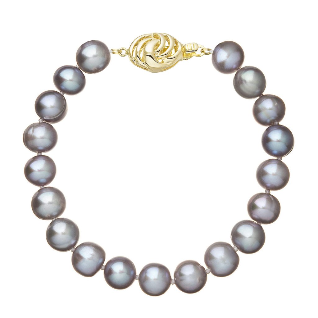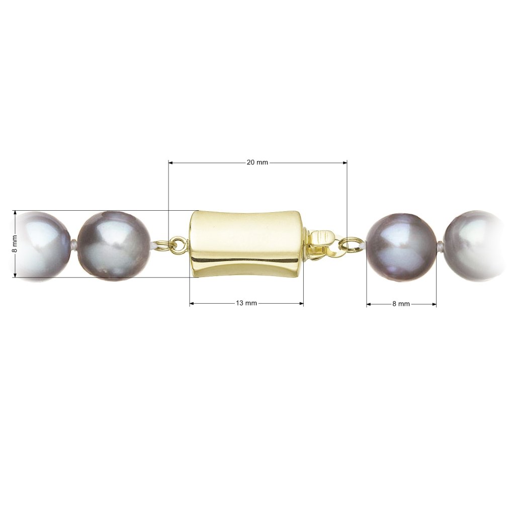 S náramkom z pravých sladkovodných kultivovaných riečnych perál budete v spoločnosti očarujúce! Jedinečný perlový náramok 923010.3 doplnený o zlaté 14 karátové zapínanie bude neprehliadnuteľný. Náramok je navlečený z okrúhlych pravých riečnych perál v šedých odtieňoch, kvality A a je zaistený uzlíkovou väzbou, ktorá zabraňuje posúvaniu a poškodeniu perál trením o seba a rovnako chráni perly pred rozsypaním, pokiaľ sa náramok náhodou pretrhne.