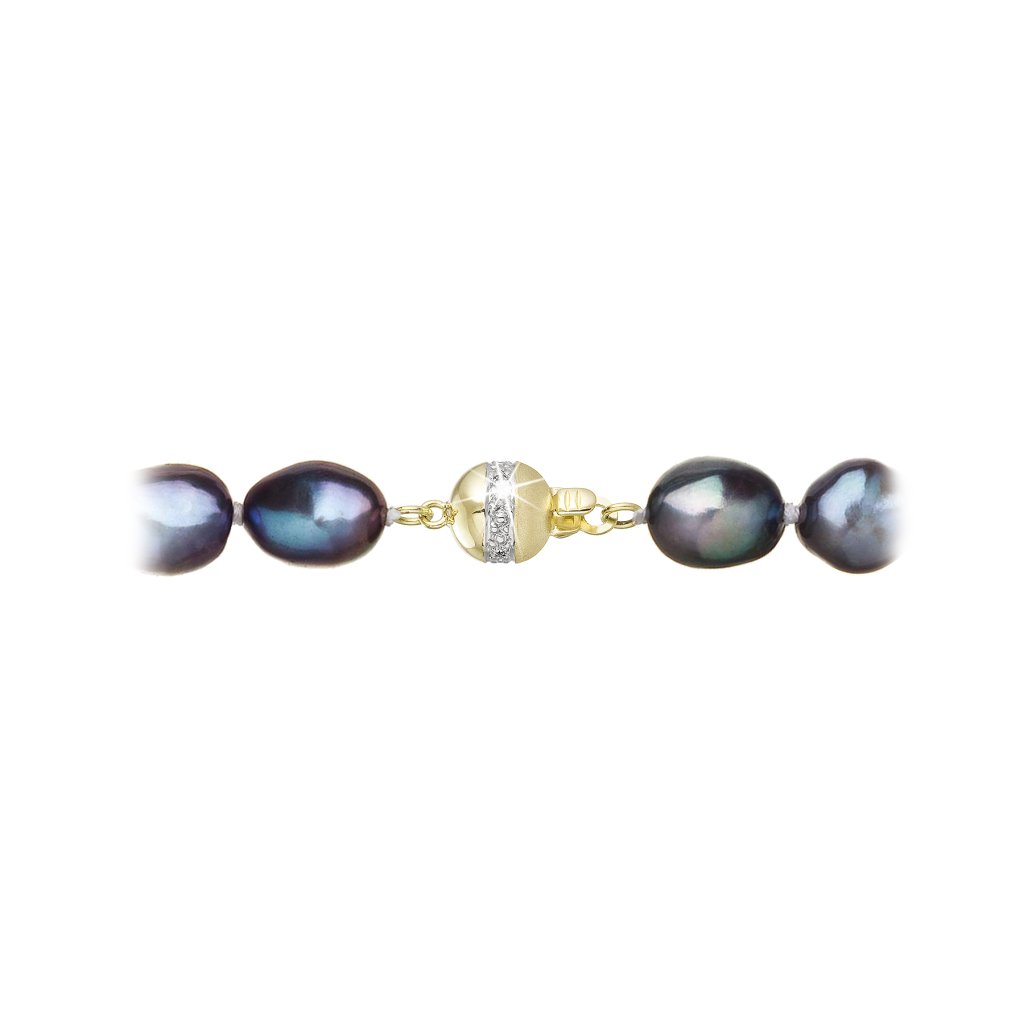 S náramkom z pravých sladkovodných kultivovaných riečnych perál budete v spoločnosti očarujúce! Jedinečný perlový náramkom 823011.3 doplnený o zlaté 14 karátové zapínanie bude vo Vašom dekolte neprehliadnuteľný. Náramok je navlečený z pravých modrofialových peacock riečnych perál kvality A a je zaistený uzlíkovou väzbou, ktorá zabraňuje posúvaniu a poškodeniu perál trením o seba a rovnako chráni perly pred rozsypaním, pokiaľ sa náramok náhodou pretrhne.