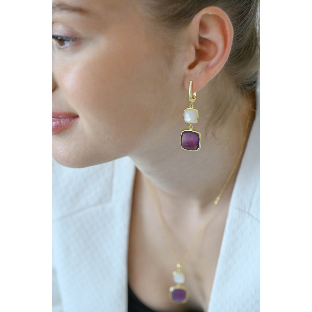 Náušnice sú vyrobené z pozláteného striebra tej najvyššej kvality. Výrazný dizajn dvoch vertikálne umiestnených štvorcov vytvára dynamickú kompozíciu plnú kontrastu a elegancie. Menší štvorec je jemne zdobený nežnou bielou perleťou, zatiaľ čo väčší štvorec je vyplnený vzácnym ametystom v hlbokých fialových tónoch, ktorý v sebe ukrýva energiu pokoja a vnútornej transformácie. Pozlátená povrchová úprava striebra dodáva šperku teplý, elegantný tón. Pohodlné zapínanie na ruský patent zaručuje spoľahlivé a bezpečné nosenie.