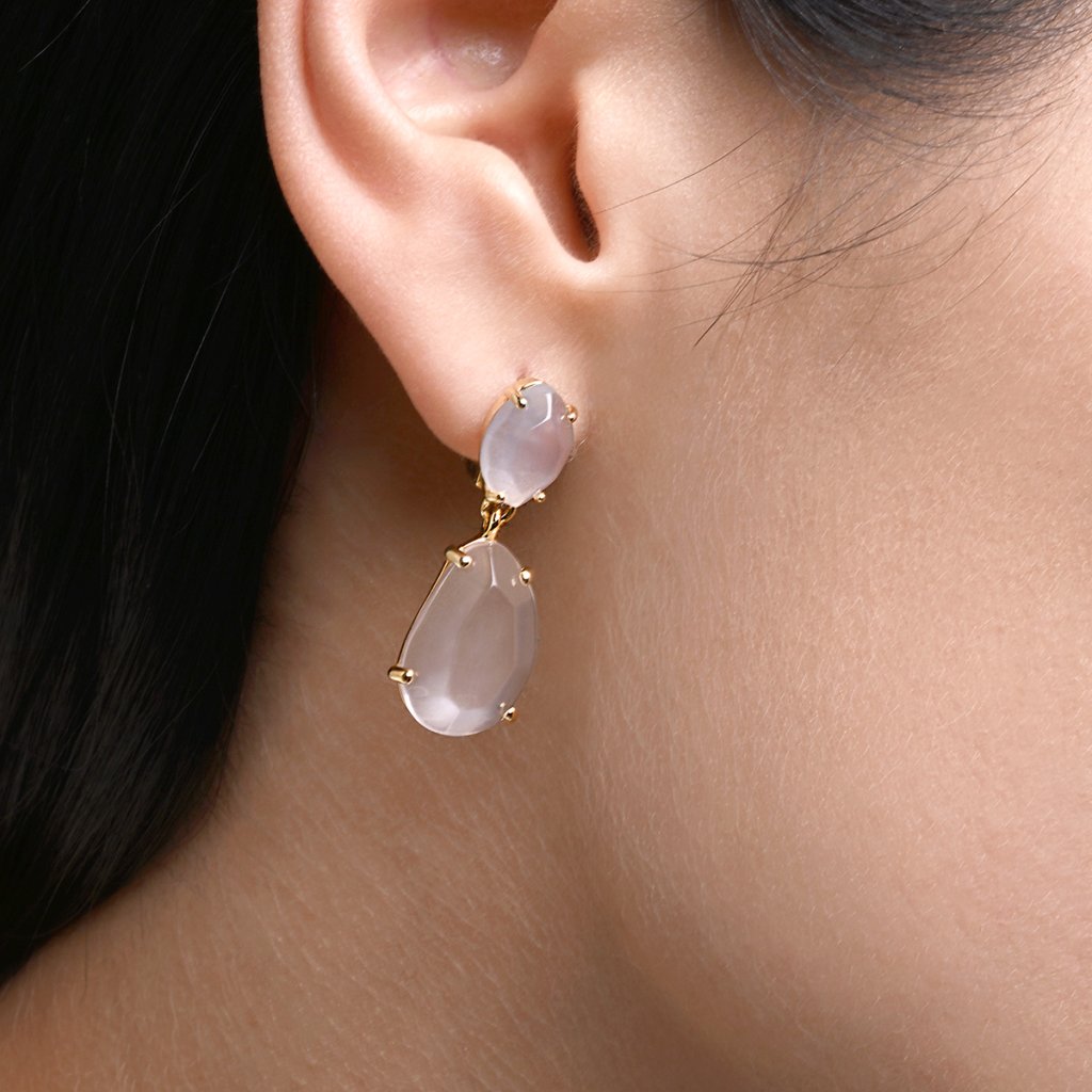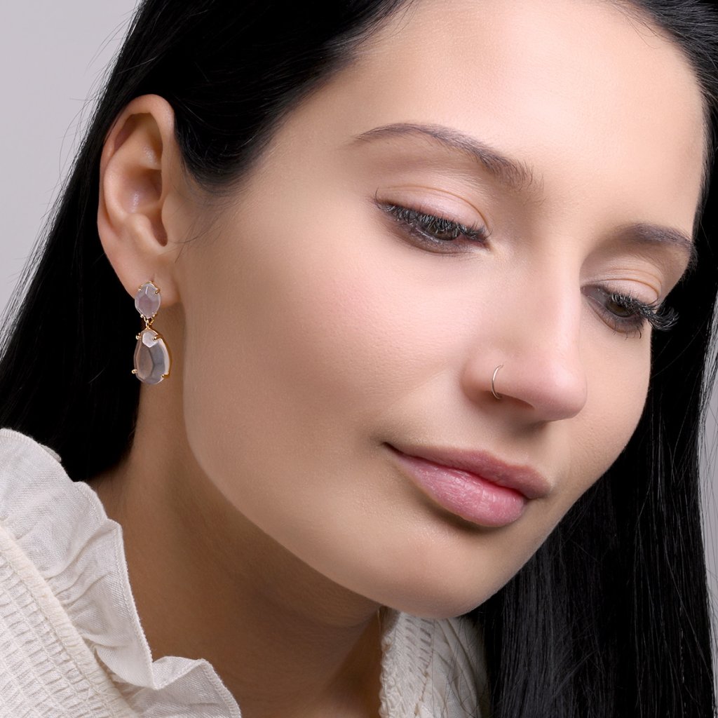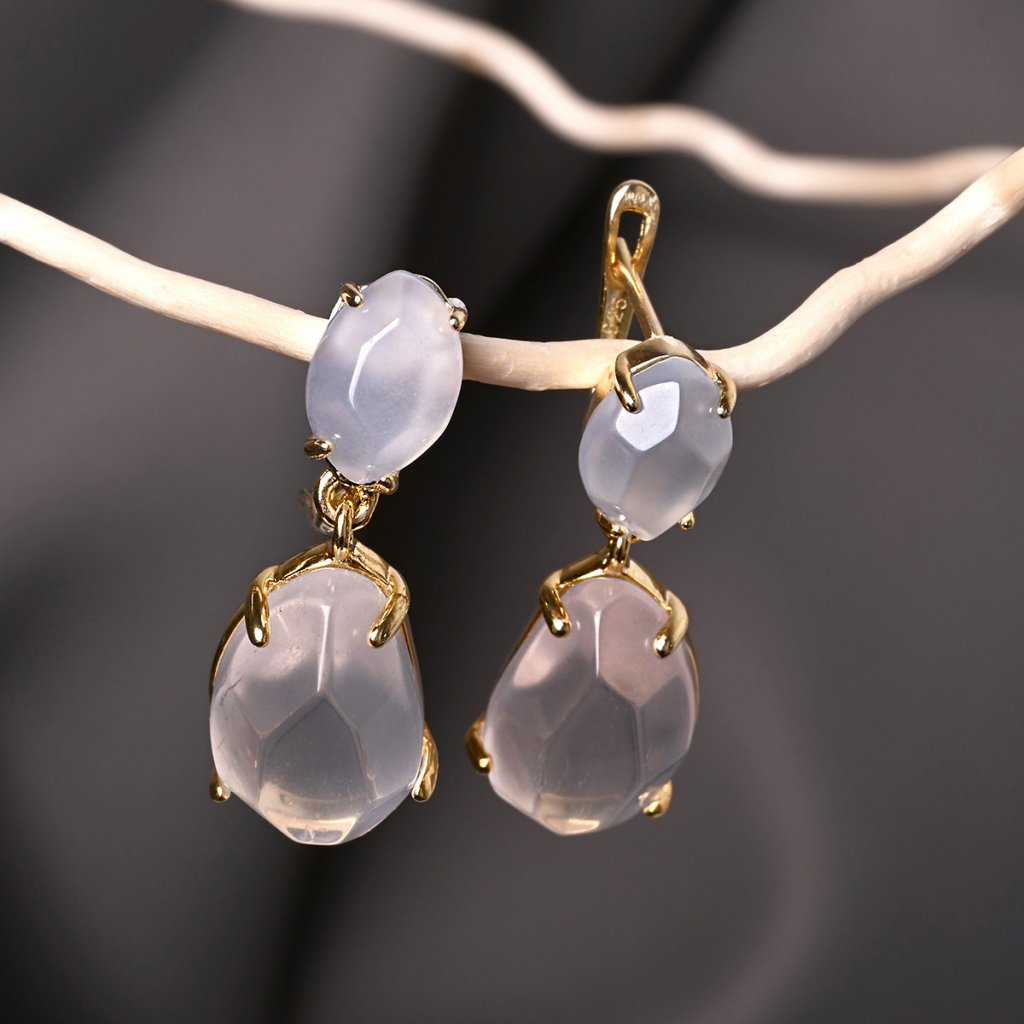 Náušnice sú vyrobené z pozláteného striebra najvyššej kvality rýdzosti 925/1000. Šperk zdobia dva vzácne kamene v nádhernom, takmer sochárskom prevedení - väčší, nežne ružový ruženín a menší, jemne modrošedý chalcedón. Ich vertikálne usporiadanie vytvára dynamickú kompozíciu plnú kontrastu a harmónie. Pozlátený povrch dodáva náušniciam teplý, jemný lesk, ktorý dokonale rozžaruje krásu kameňov. Pohodlné zapínanie na ruský patent zaručuje spoľahlivé a bezpečné nosenie.