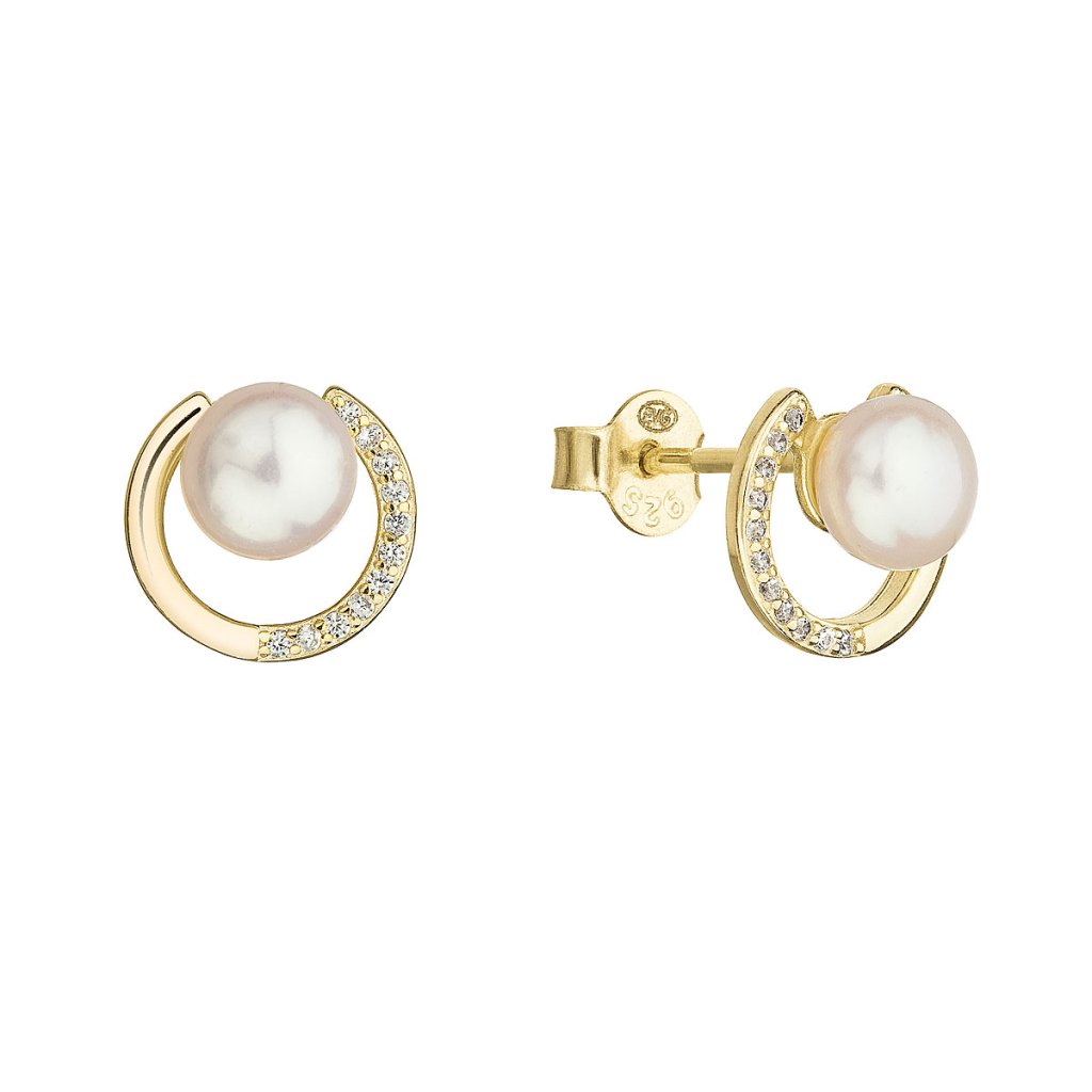 Rozmýšľate, čím by ste mohli potešiť? Vyskúšajte jedinečne spracované pozlátené strieborné náušnice s bielou riečnou perlou a zirkónmi 21067.1.