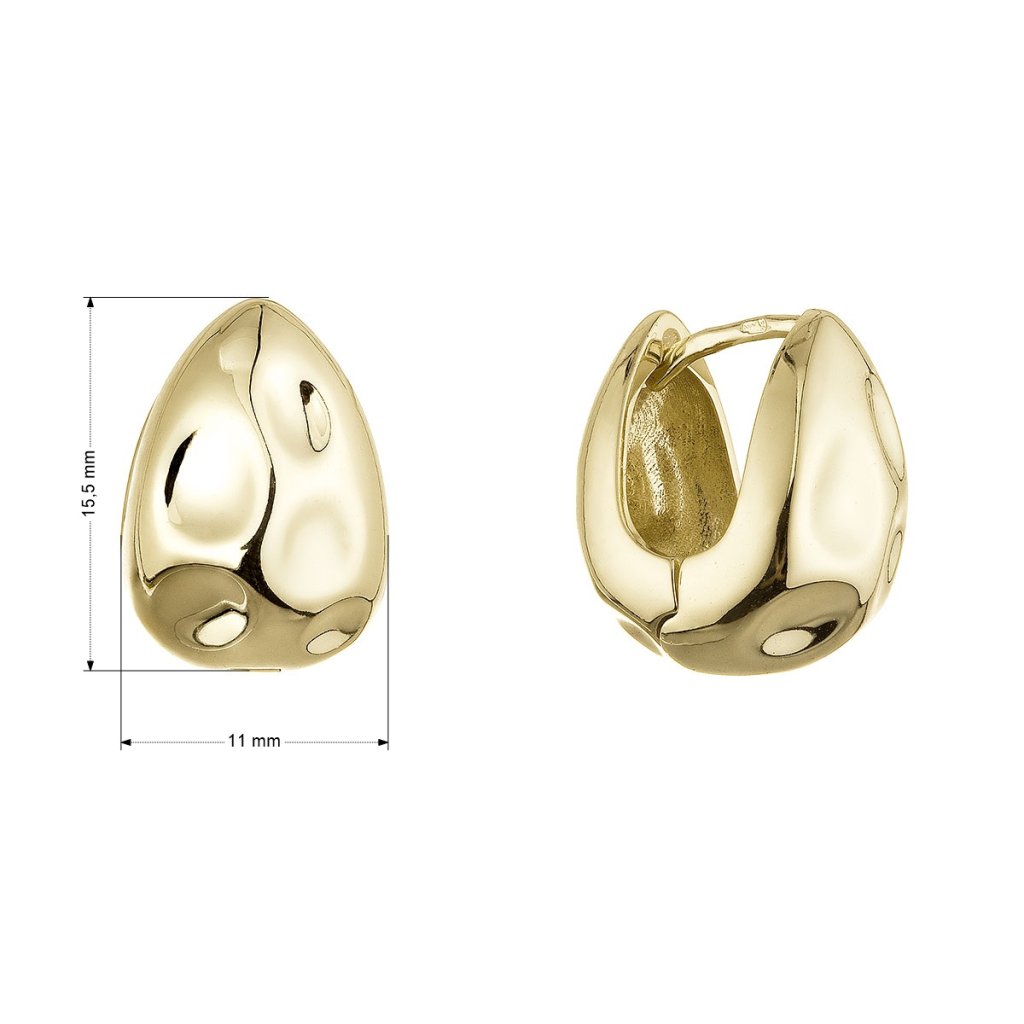 Výrazné pozlátené náušnice okamžite upútajú svojim neobvyklým tvarom aj štruktúrovaným povrchom. Masívna silueta evokuje kvapku - elegantne zaoblený tvar, ktorý jemne predlžuje líniu ucha. Povrch kovu nie je úplne hladký – je ozvláštnený efektnými priehlbinami, ktoré hrajú so svetlom a vytvárajú jemný organický dojem. Každý pohyb hlavou tak náušnice premení na žiarivý detail.