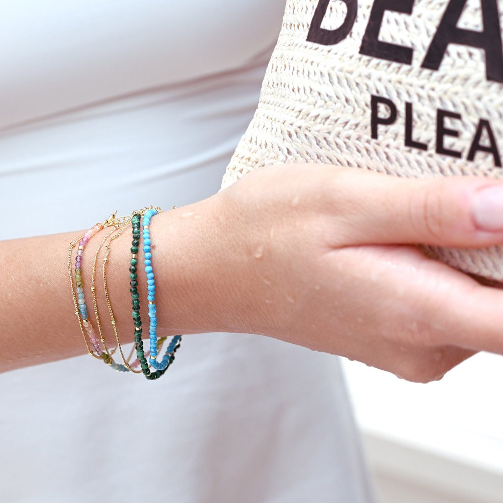 Tento štýlový dvojitý náramok spája zlatistú retiazku z pozláteného striebra a líniu drobných korálikov z pravého malachitu v bohatej zelenej farbe. Teplý odtieň zlata sa dokonale dopĺňa s hlbokými tónmi malachitu, vďaka čomu šperk pôsobí elegantne a harmonicky. Vyrobený zo striebra rýdzosti 925/1000 pokrytého vrstvou zlata. Zapínanie na karabínku a predlžovaciu retiazku umožňujú upraviť dĺžku zo 17 cm o ďalšie 4 cm . Náramok, ktorý dodá každému outfitu kvapku luxusu a prírodnej energie.