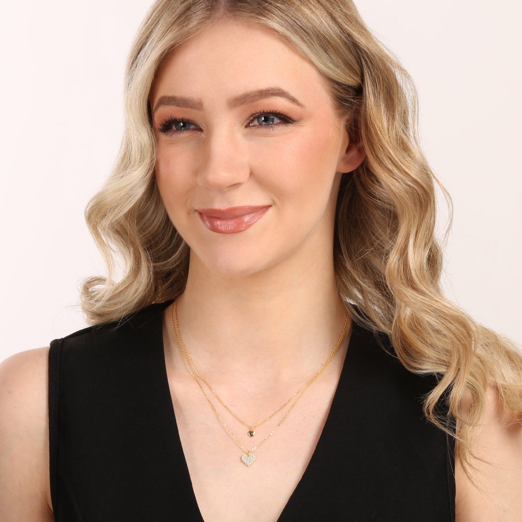 Pozlátený dvojradový náhrdelník 12153.1 očarí jemným a romantickým dizajnom, ktorý elegantne kombinuje dve retiazky v jednom šperku . Kratšiu retiazku zdobí drobné hladké srdiečko, zatiaľ čo na dlhšom sa vyníma väčšie srdce vysadené trblietavými zirkónmi. Vďaka vrstvenému efektu pôsobí šperk moderne a zároveň veľmi žensky – ideálny na každodenné nosenie i slávnostné chvíle.