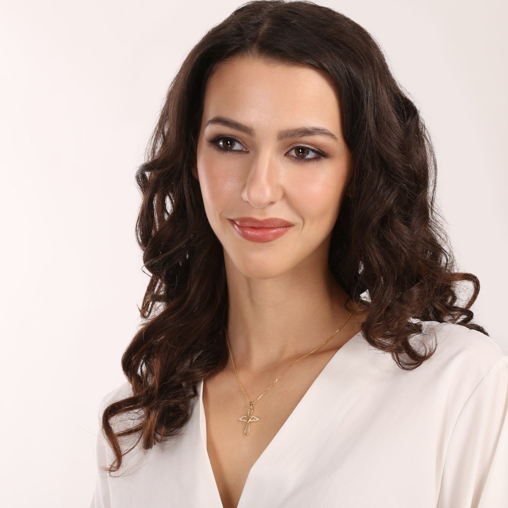Pozlátený náhrdelník s príveskom anjela je nádherným symbolom ochrany, lásky a duchovnej sily. Prívesok má jemne prepracovanú siluetu anjela s elegantnými krídlami zdobenými trblietavými zirkónmi, ktoré dodávajú šperku jemný a žiarivý lesk. V centre anjelskej postavy sa nachádza srdce - silný symbol lásky a starostlivosti.