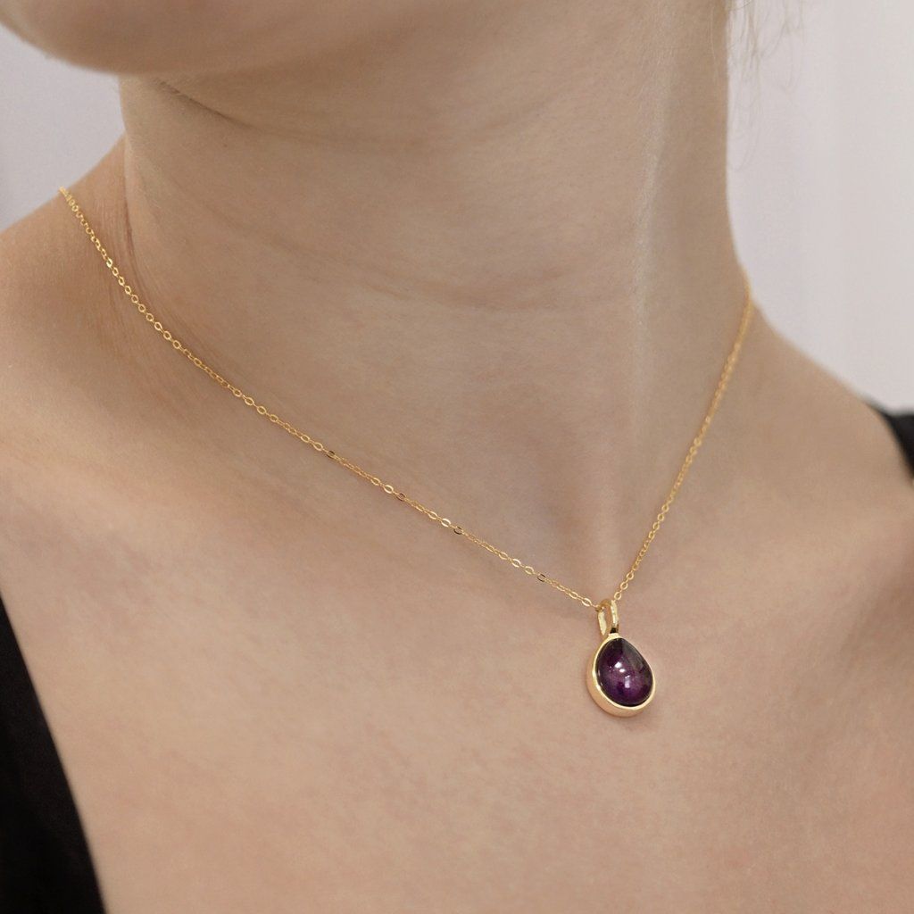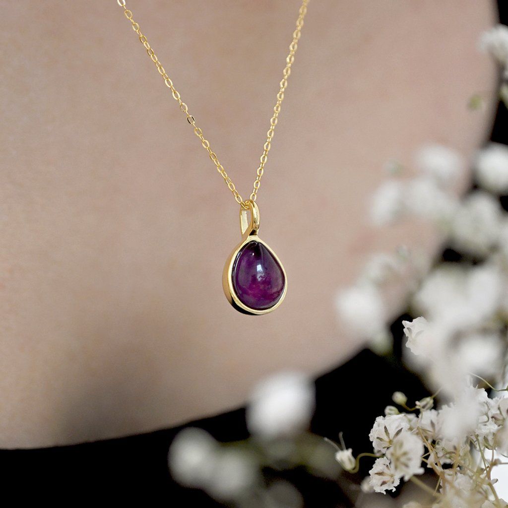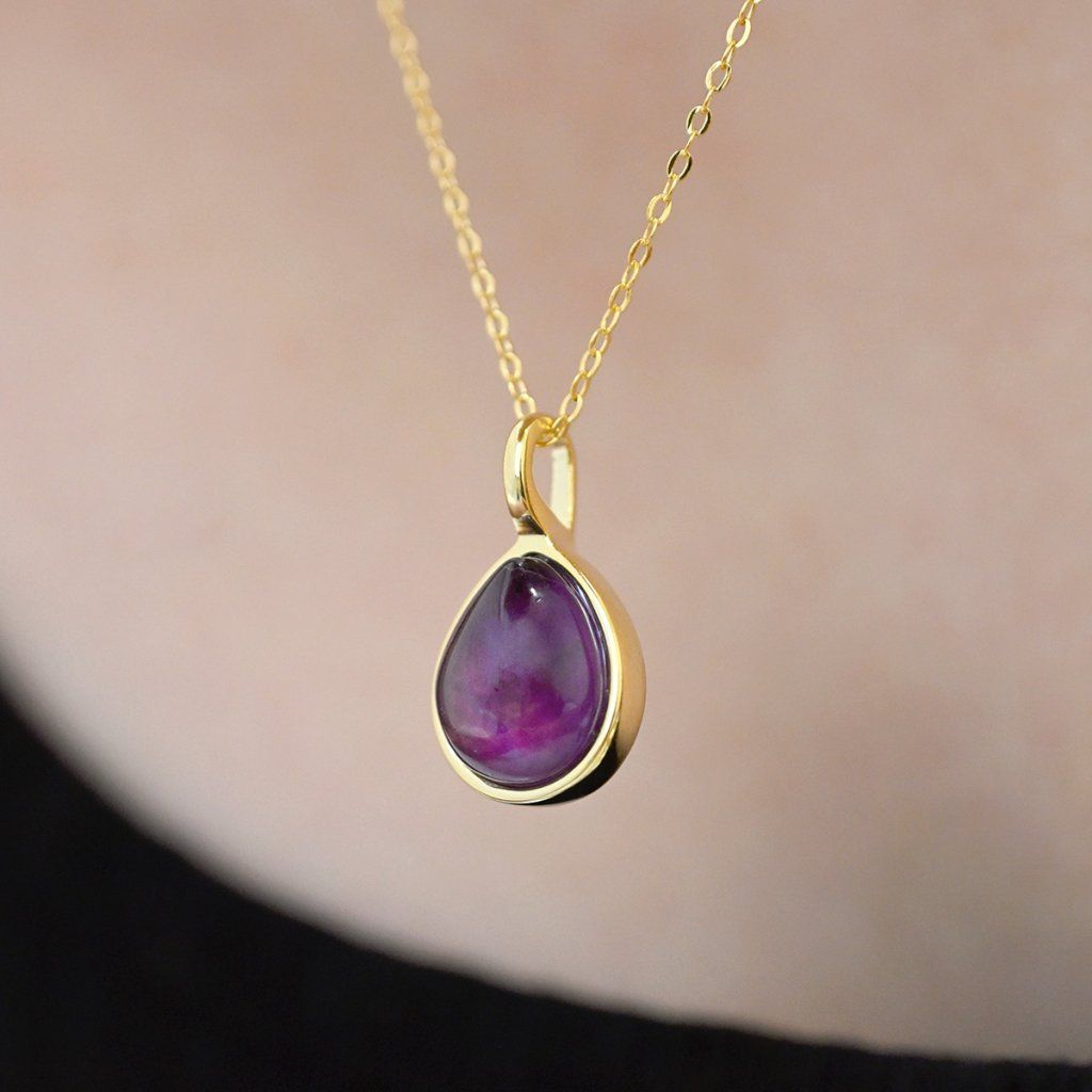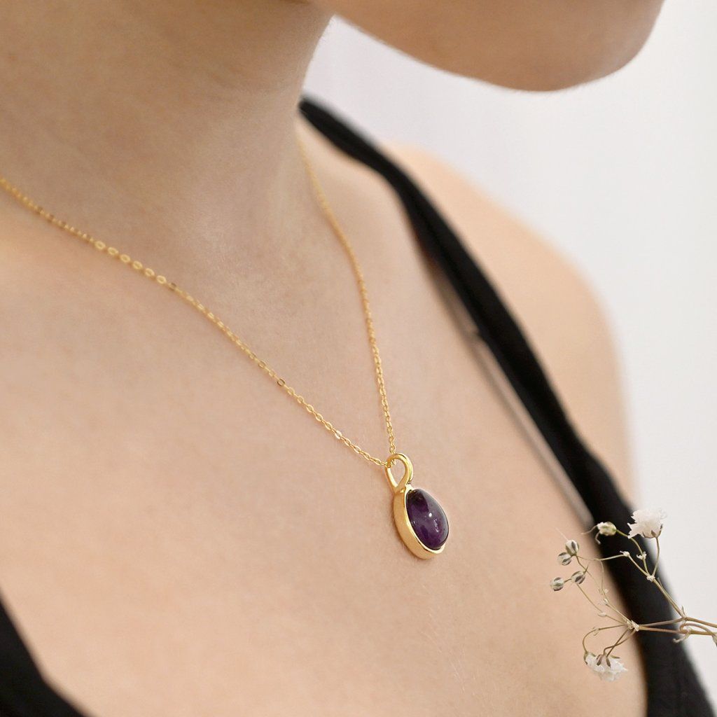 Náhrdelník je vyrobený zo striebra rýdzosti 925/1000 s jemným pozláteným povrchom , ktorý prepožičiava šperku luxusný a teplý lesk. Jeho jedinečný tvar kvapky je precízne zdobený prírodným ametystom vo fialovej farbe, ktorý je lemovaný zlatistou linkou pozláteného striebra.