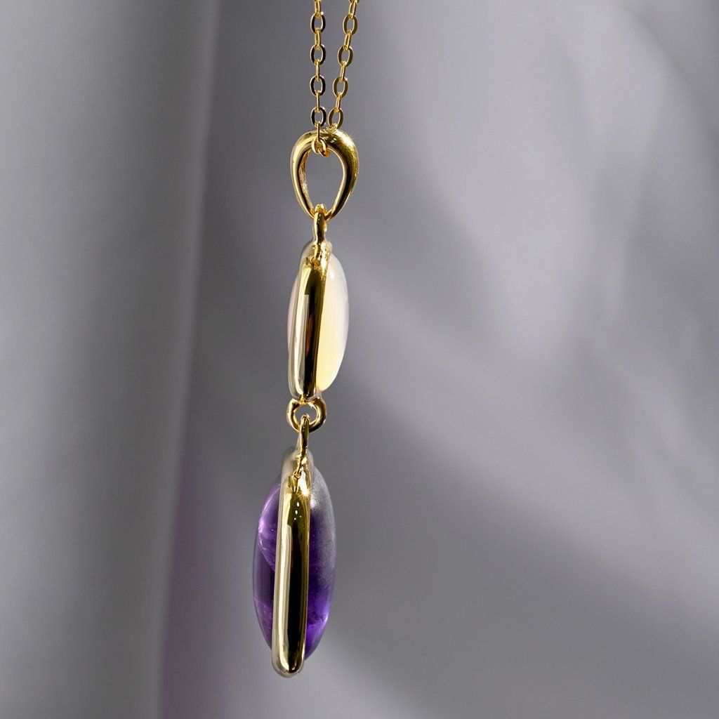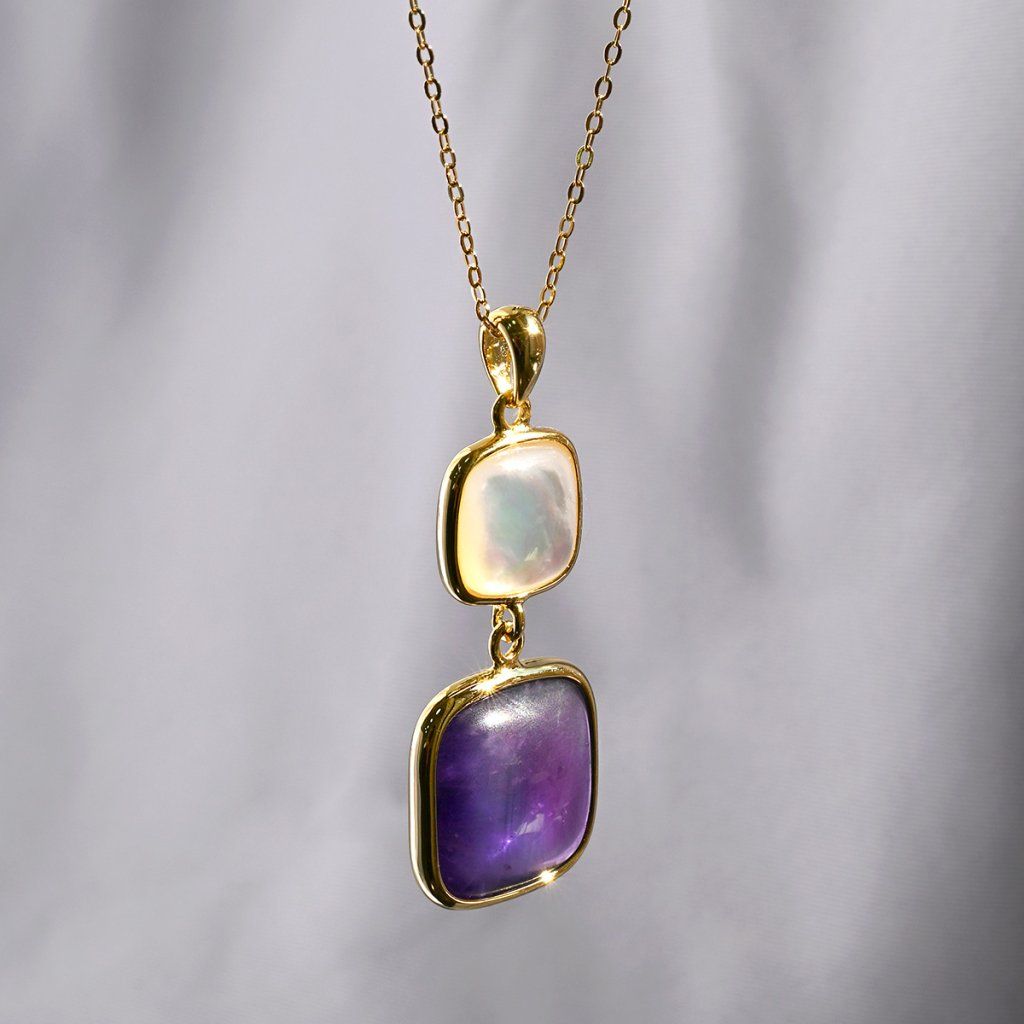 Náhrdelník s príveskom je umeleckým dielom, ktoré spája jemný lesk pozláteného striebra 925/1000 s výnimočnou krásou prírodných materiálov. Luxusný prívesok v tvare dvoch nad sebou zavesených štvorcov vytvára jedinečnú kompozíciu - väčší štvorec osadený sýtym fialovým prírodným ametystom symbolizuje hĺbku duchovna a intuície, zatiaľ čo menší štvorec vyplnený jemnou bielou perleťou prináša krehkú eleganciu a vnútorný pokoj.