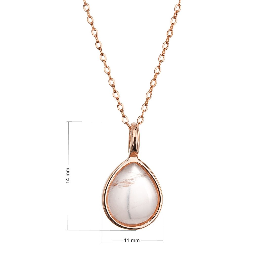 Náhrdelník je vyrobený z pozláteného striebra rýdzosti 925/1000 v úprave rose gold, ktorý prepožičiava šperku luxusný a teplý lesk. Jeho jedinečný tvar kvapky je precízne zdobený prírodným ruženínom v jemnej ružovej farbe, ktorý je lemovaný zlatistou linkou pozláteného striebra.