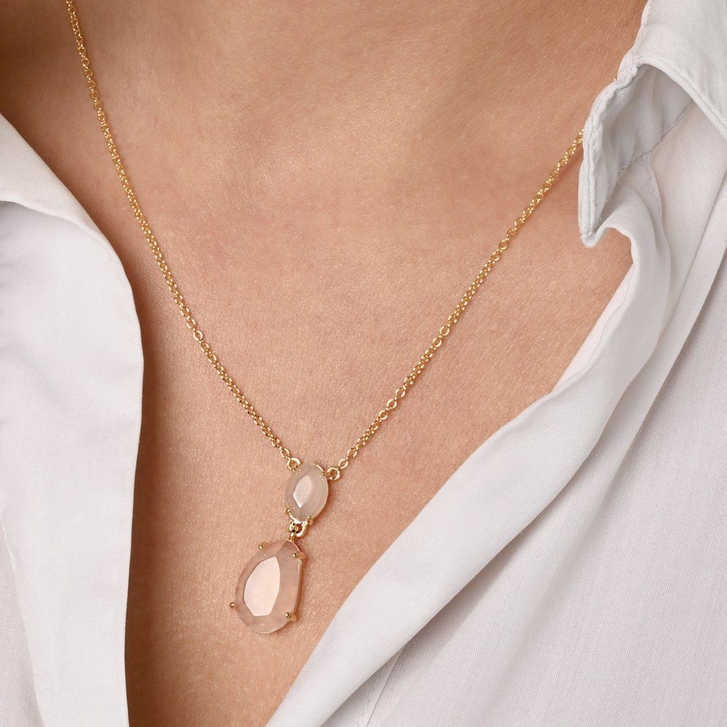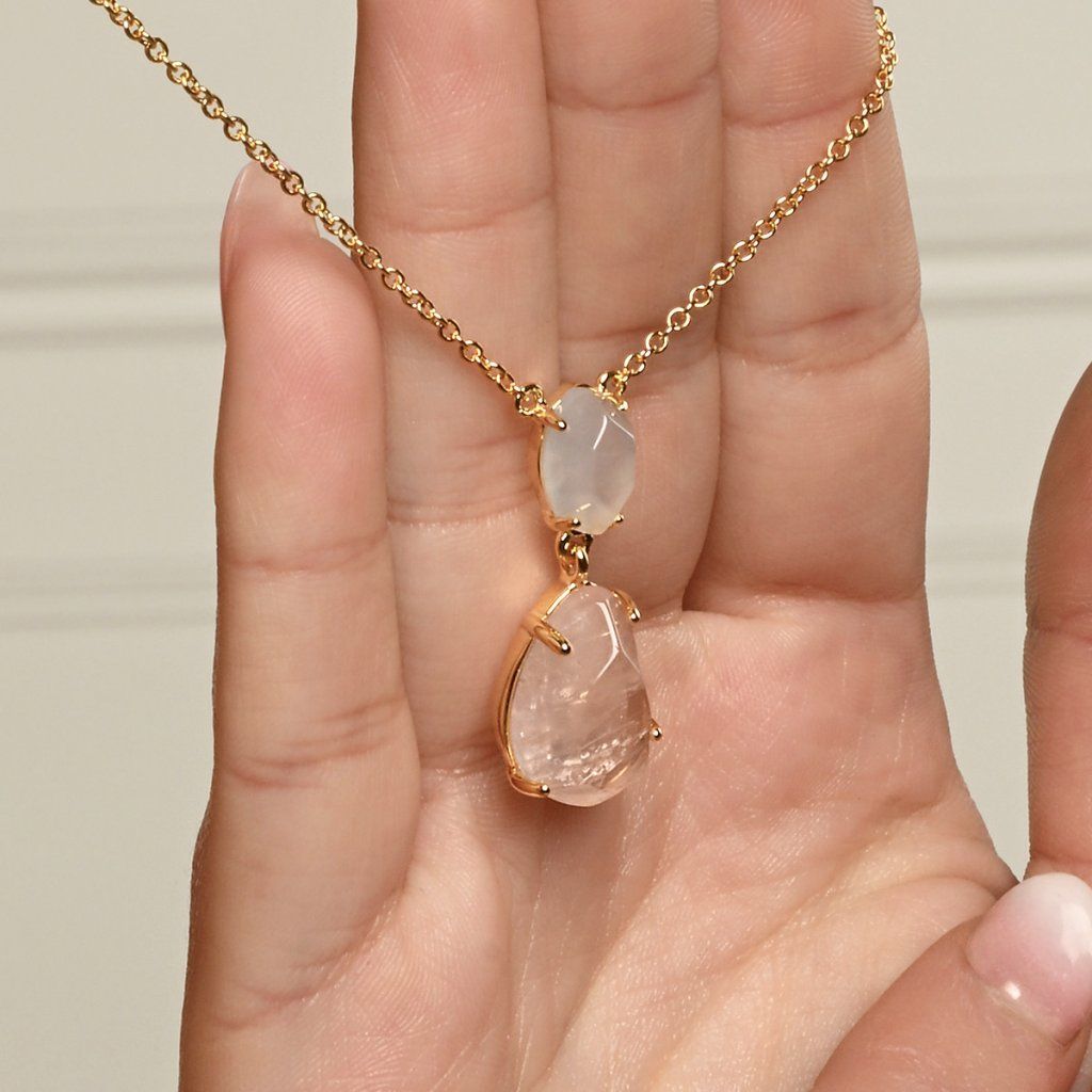 Náhrdelník s príveskom je vytvorený zo striebra rýdzosti 925/1000 s pozlátenou úpravou, ktorá dodáva šperku teplý a luxusný nádych. Precízne zasadené prírodné kamene - menší chalcedón a väčší ruženín - sú umiestnené vertikálne nad sebou a vytvárajú tak dynamickú kompozíciu. Ich jemné odtiene vytvárajú nežný, romantický dojem. Nepravidelné tvary kameňov podčiarkujú ich prirodzenú krásu a jedinečnosť - každý šperk je tak úplne originálny, rovnako ako každý okamih v prírode.