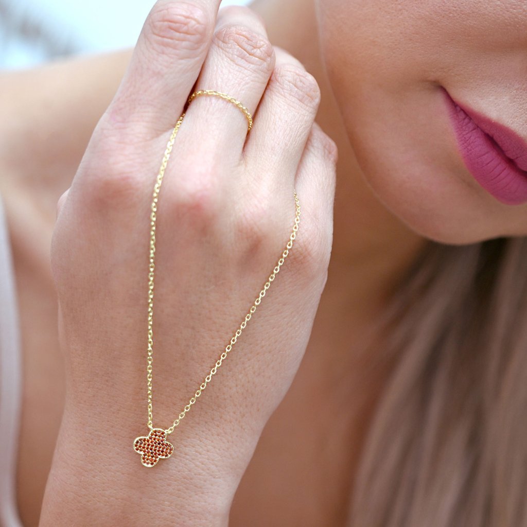 Náhrdelník je precízne spracovaný z pozláteného striebra rýdzosti 925/1000. Každý lístoček štvorlístka je starostlivo vysadený drobnými zirkónmi v oranžovej farbe, ktoré pri najmenšom pohybe rozohrávajú nádhernú hru svetla.