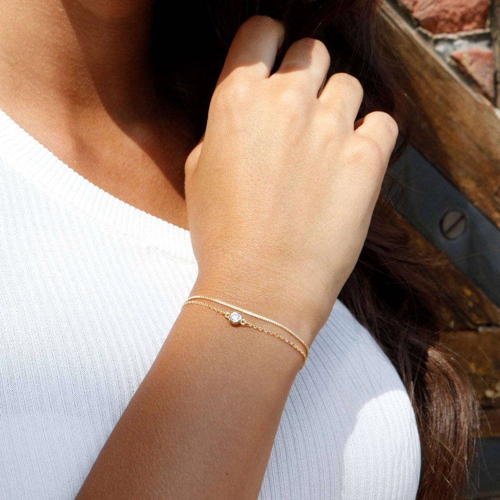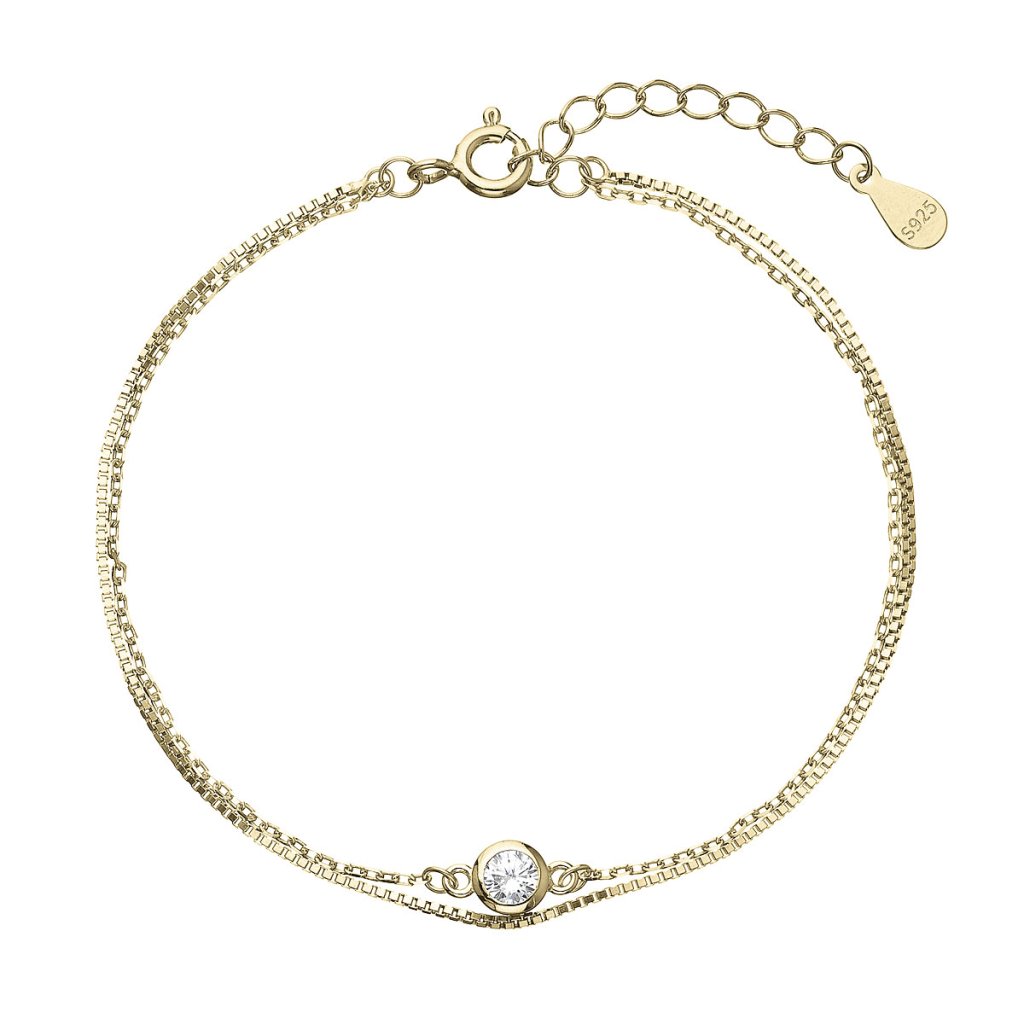 Moderný a elegantný je dvojitý pozlátený náramok so žiarivým zirkónom. Choďte s módou a urobte sebe alebo druhým radosť náramkom s dvojitou retiazkou, každý v inom dizajne a navyše s krásnym zirkónom. Zirkón je malý len 5 mm, krásne sa k retiazkam hodí. Na vašom zápästí bude luxusne žiariť.