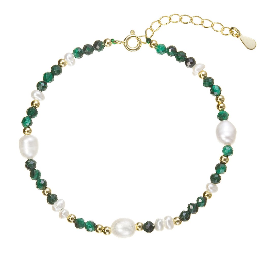 Tento jemný náramok kombinuje pravé riečne perly rôznych tvarov s elegantnými korálkami malachitu v bohatej zelenej farbe. Prirodzený lesk perál vyniká v kontraste s hlbokými tónmi malachitu, ktoré šperku dodávajú harmóniu a prírodnú eleganciu.