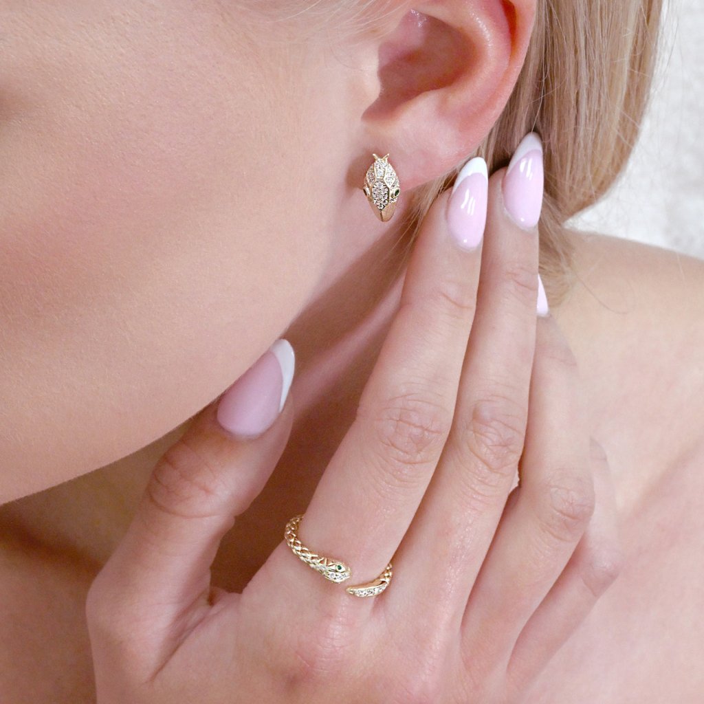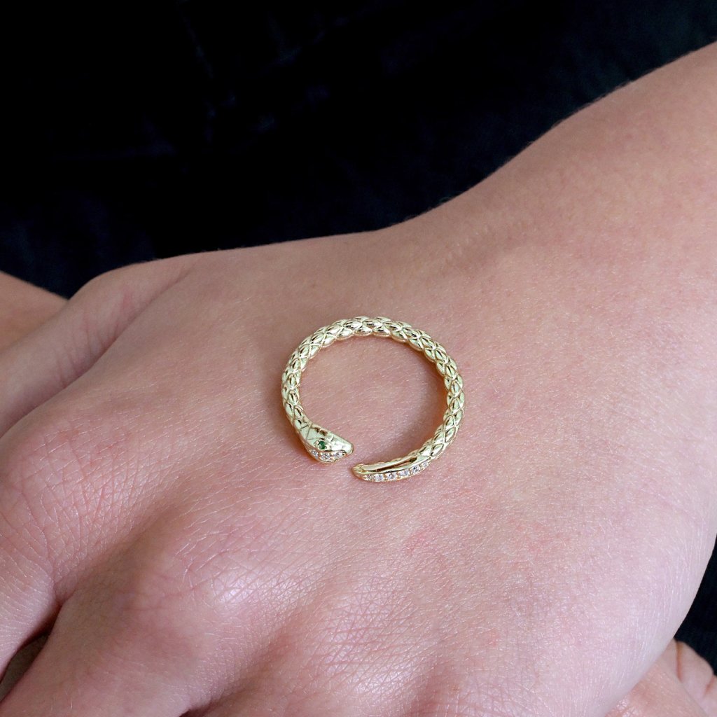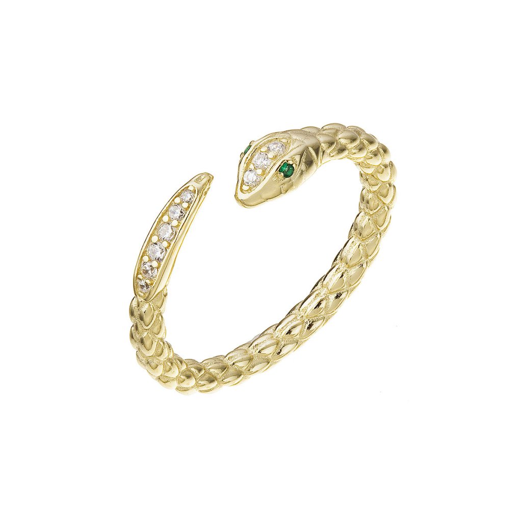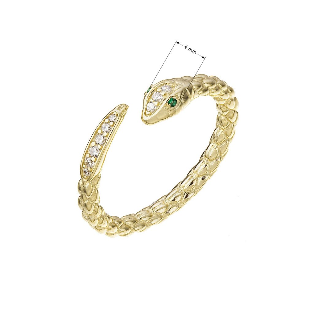 Tento obľúbený prsteň, ktorým je obtočený had okolo vášho prsta je vyrobený zo striebra o rýdzosti 925/1000 a je pozlátený. Na mieste očí hada sú vsadené zelené zirkóniky.