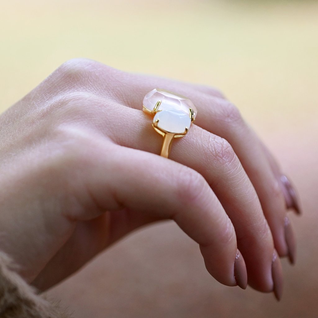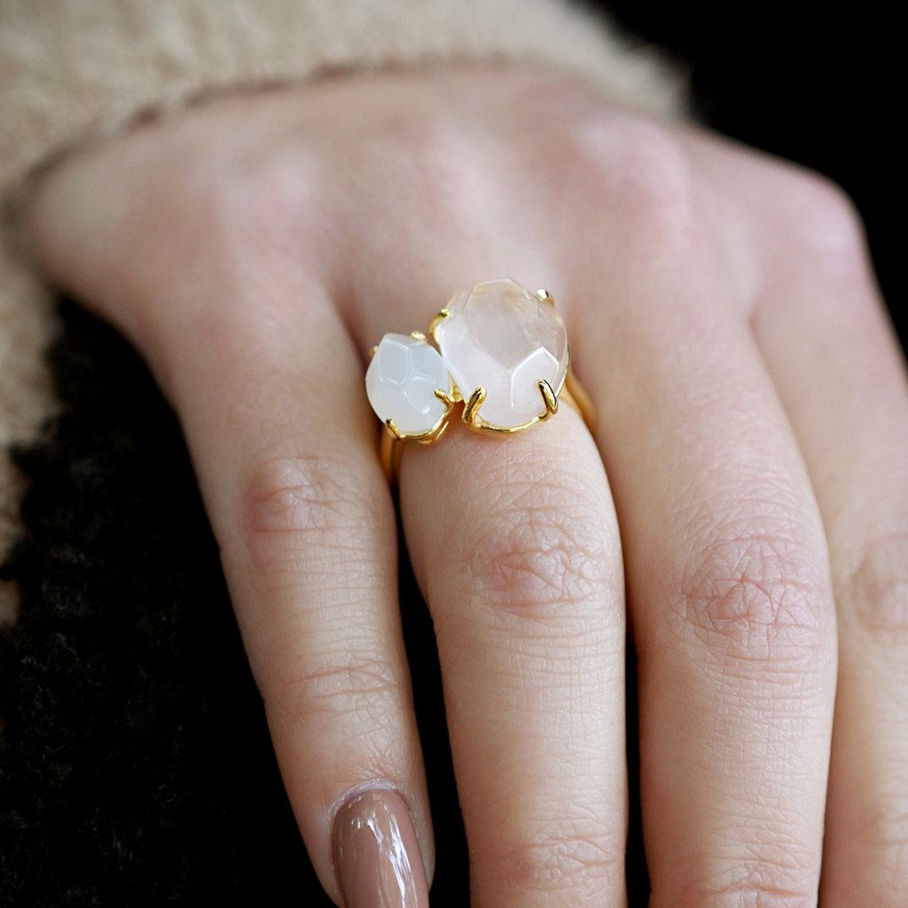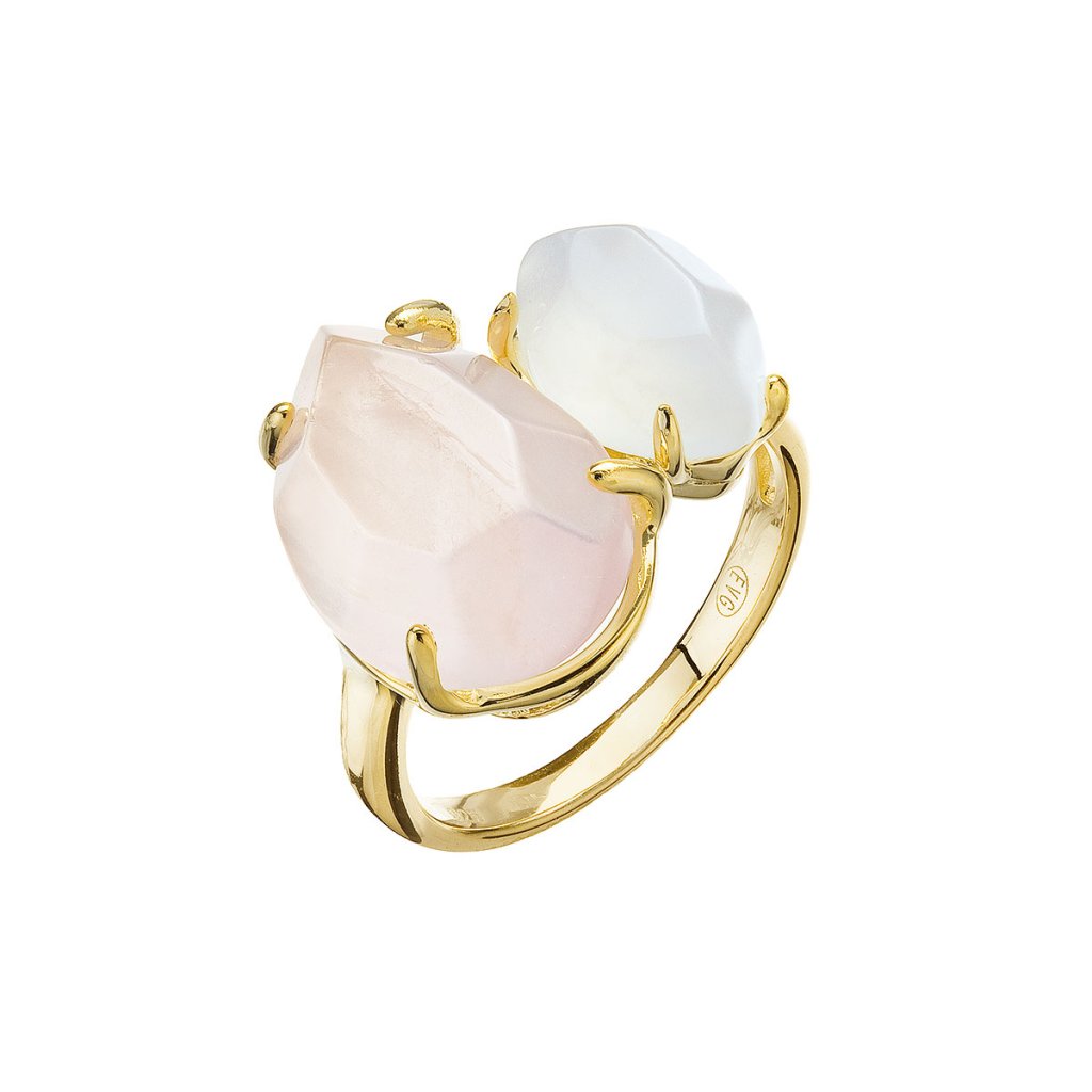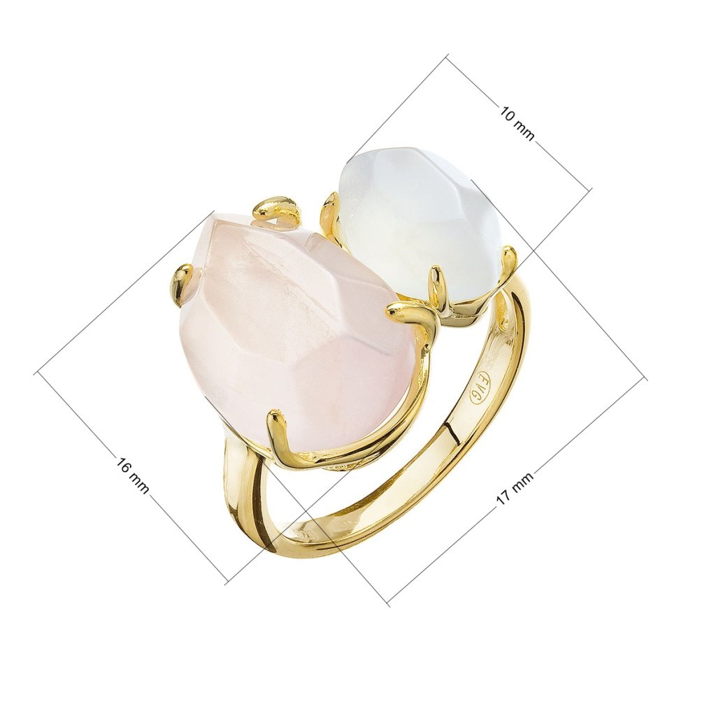 Unikátny prsteň z pozláteného striebra rýdzosti 925/1000 v sebe spája dva prírodné kamene , ktoré spolu tvoria harmóniu jemnosti a pokoja. Dominantný svetlo ružový ruženín v organickom tvare priťahuje pozornosť svojou mäkkou, ženskou energiou. Vedľa neho žiari menší, svetlo modrý chalcedón, ktorý podčiarkuje celkovú eleganciu šperku.