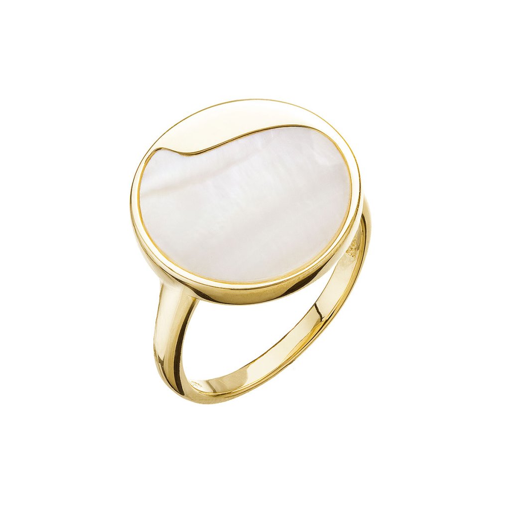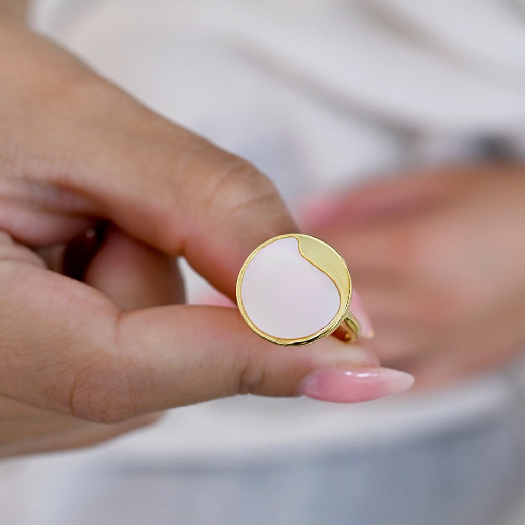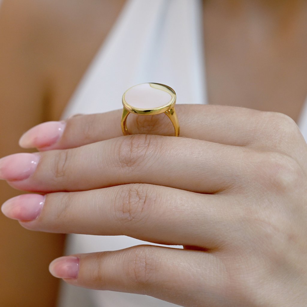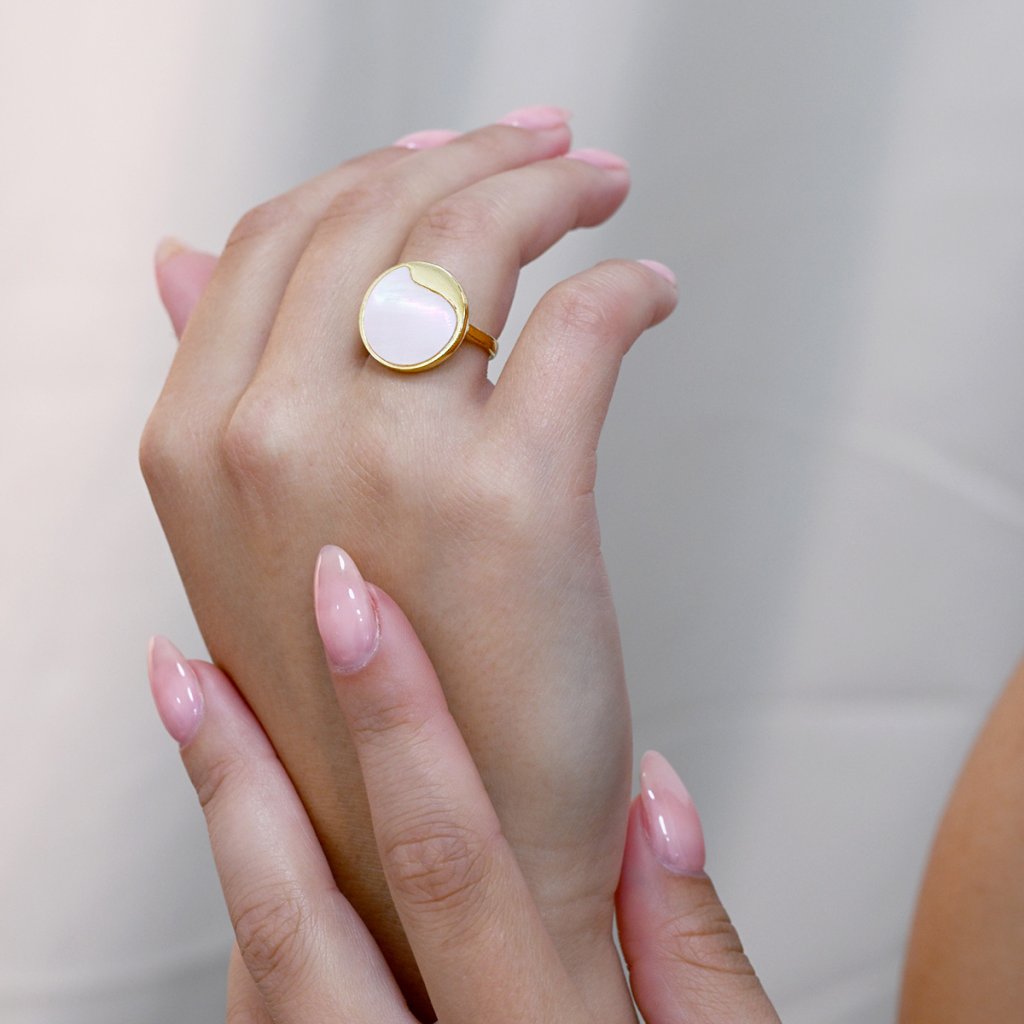 Prsteň je vyrobený z pozláteného striebra tej najvyššej kvality 925/1000. Pozlátený povrch dodáva teplý, jemný lesk. Koliesko zdobené pravou ružovou perleťou je decentne vykrojené, dodáva šperku jedinečný charakter.