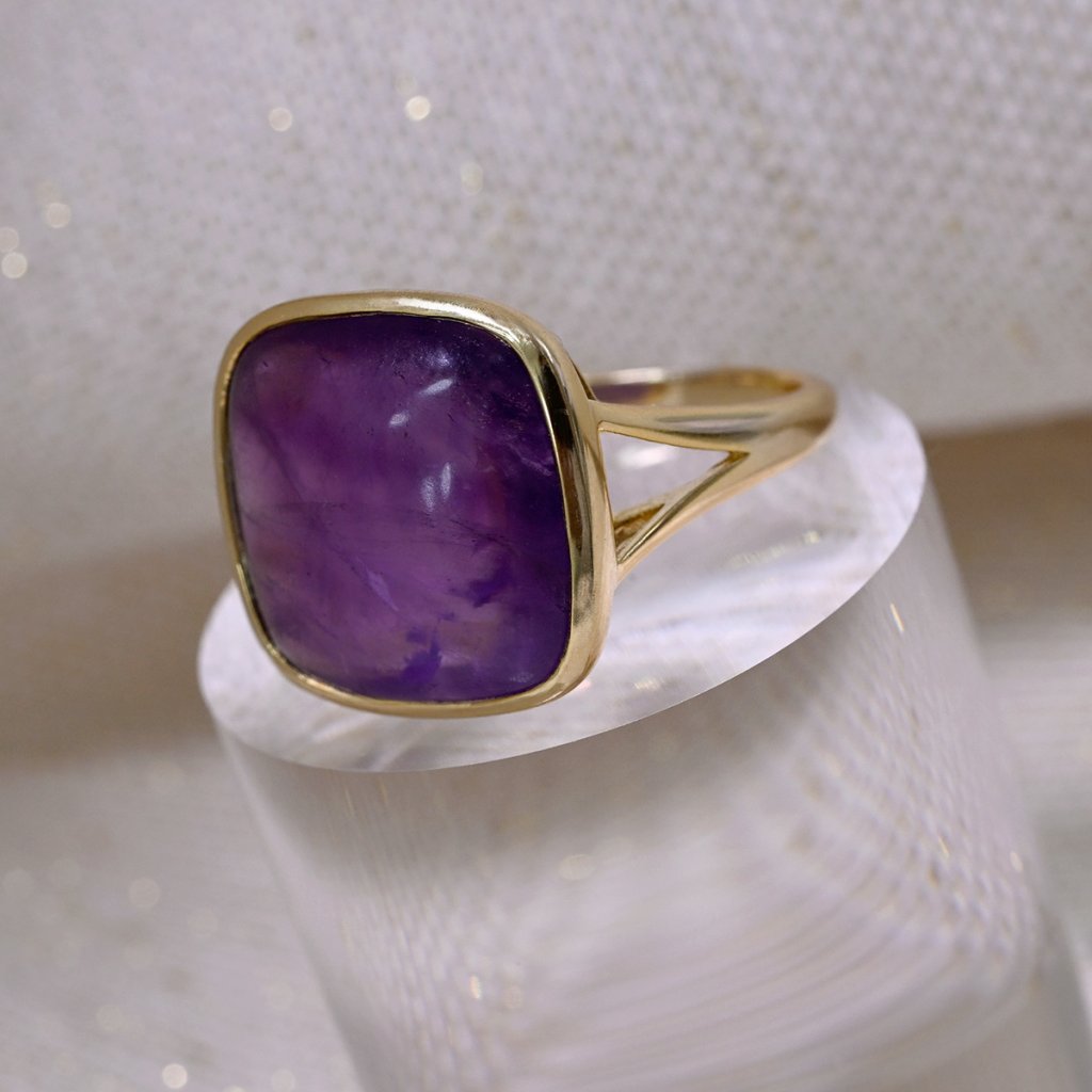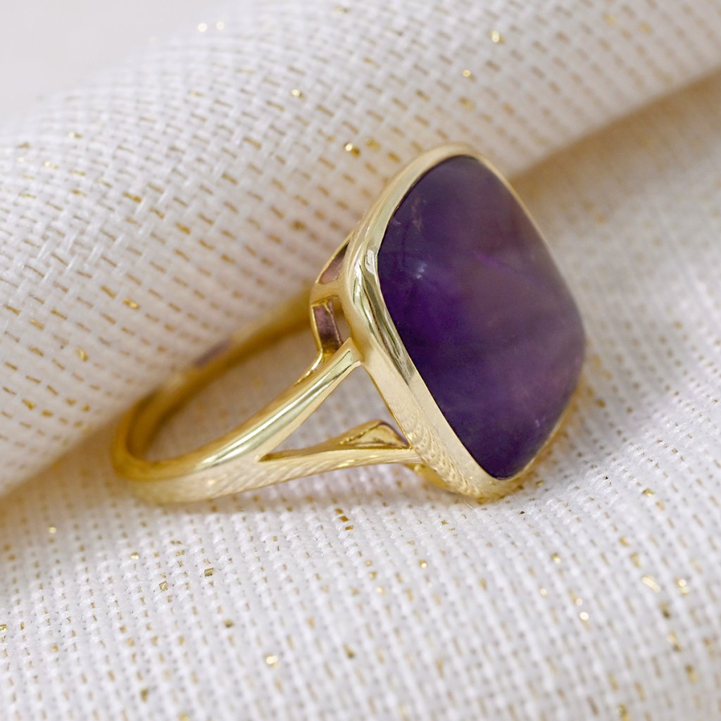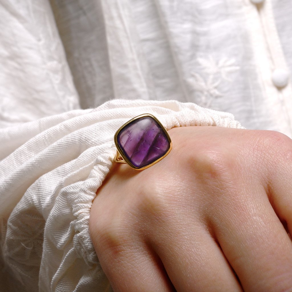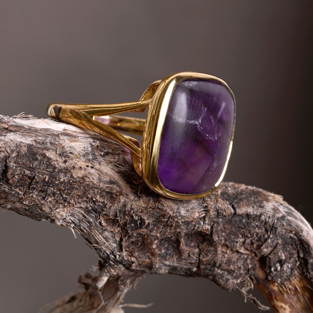 Prsteň je vyrobený z pozláteného striebra tej najvyššej kvality. Výrazný dizajn štvorcového ametystu v hlbokých fialových tónoch, ktorý v sebe ukrýva energiu pokoja a vnútornej transformácie v zlatej obrube. Pozlátená povrchová úprava striebra dodáva šperku teplý, elegantný tón.