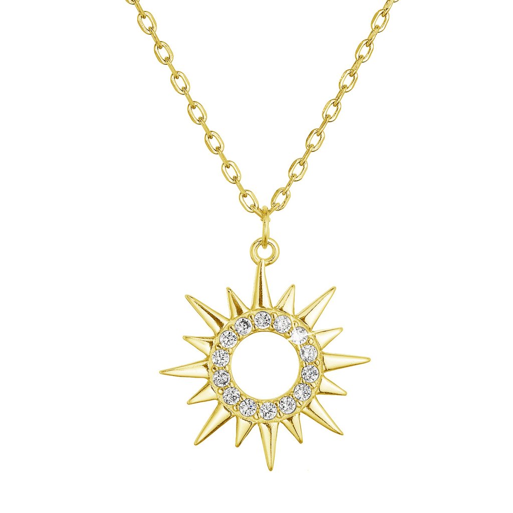 Tento zirkónmi zdobený náhrdelník so symbolom slnka je ideálny pre každú ženu, ktorá miluje preslnené dni a jasnú energiu.Náhrdelník je vyrobený z pozláteného striebra o rýdzosti 925/1000 .