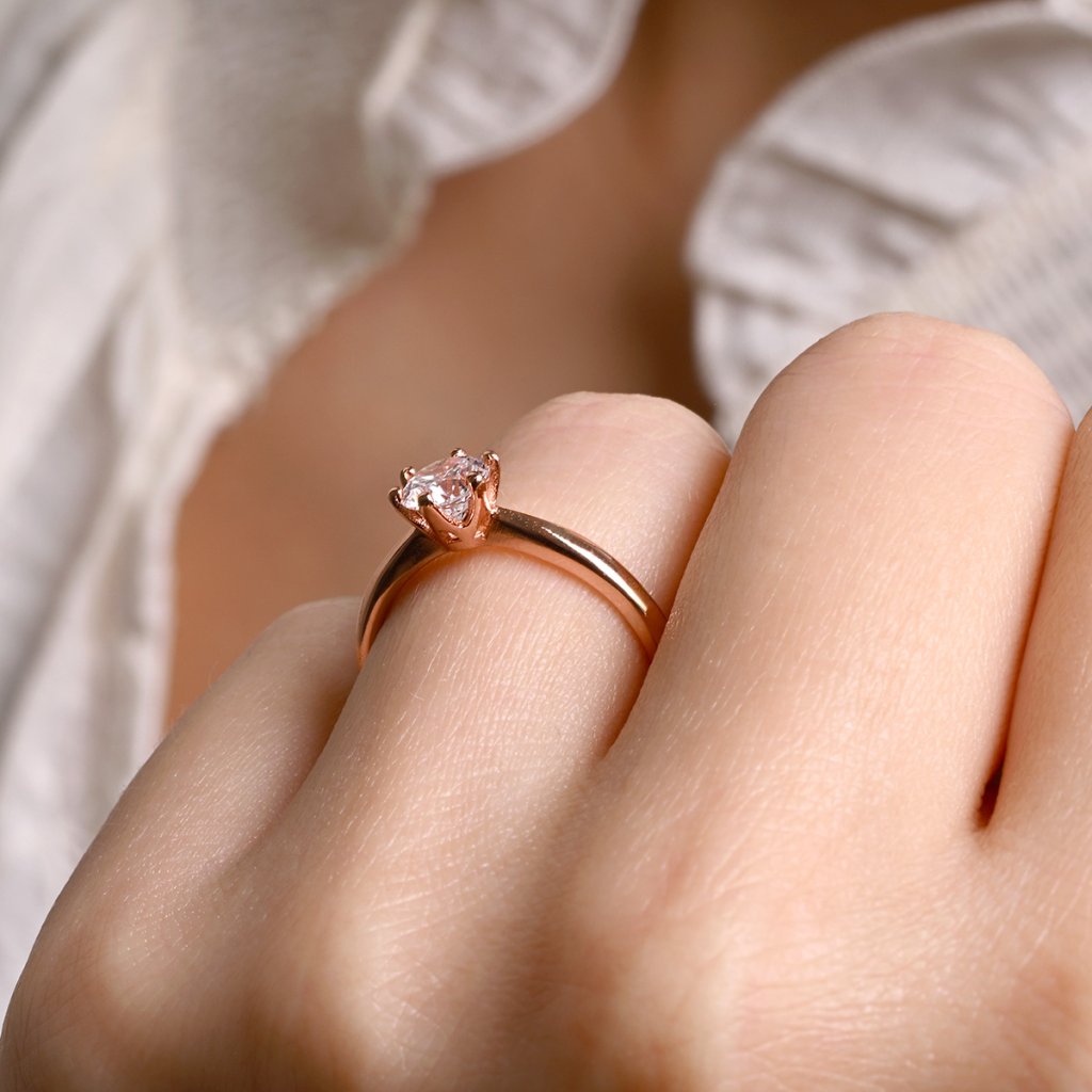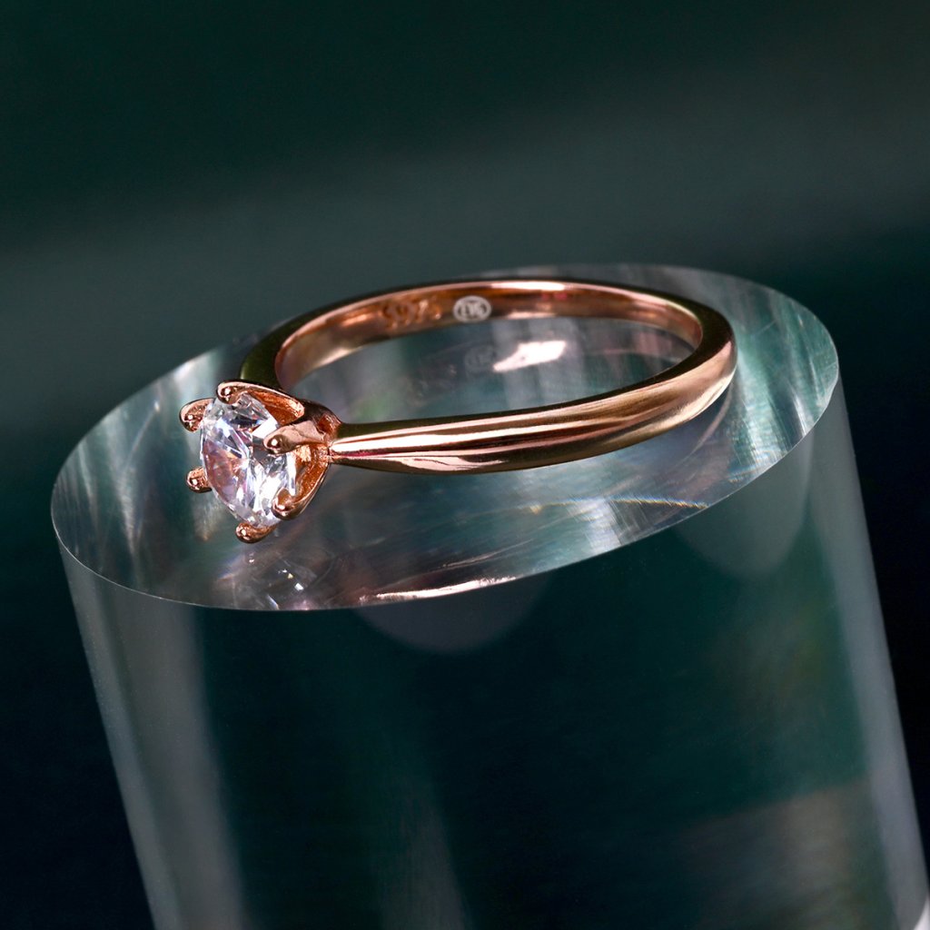 Čisté, oblé línie ružovo pozláteného strieborného krúžku dávajú vyniknúť jednému priezračnému zirkónu, ktorým je prsteň osadený. V jednoduchosti je krása a to isté platí aj o tomto prsteni. Jeho sila spočíva v súhre kovového lesku a rozžiareného kameňu.