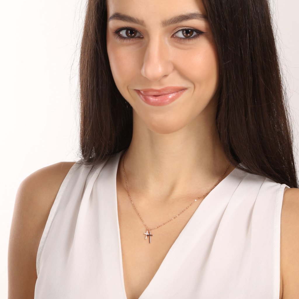 Zaujmite jedinečným originálnym náhrdelníkom, ktorý nádherne zvýrazní váš dekolt!Rose Gold pozlátený náhrdelník 12059.1 v dĺžke 45 cm je zložený z retiazky a dvoch krížikov, z ktorej jeden je bohato ozdobený zirkónmi v bielej farbe. Na výrobu náhrdelníka bolo použité pozlátené striebro rýdzosti 925/1000. Náhrdelník je vhodný aj pre alergikov, neobsahuje totiž nikel.