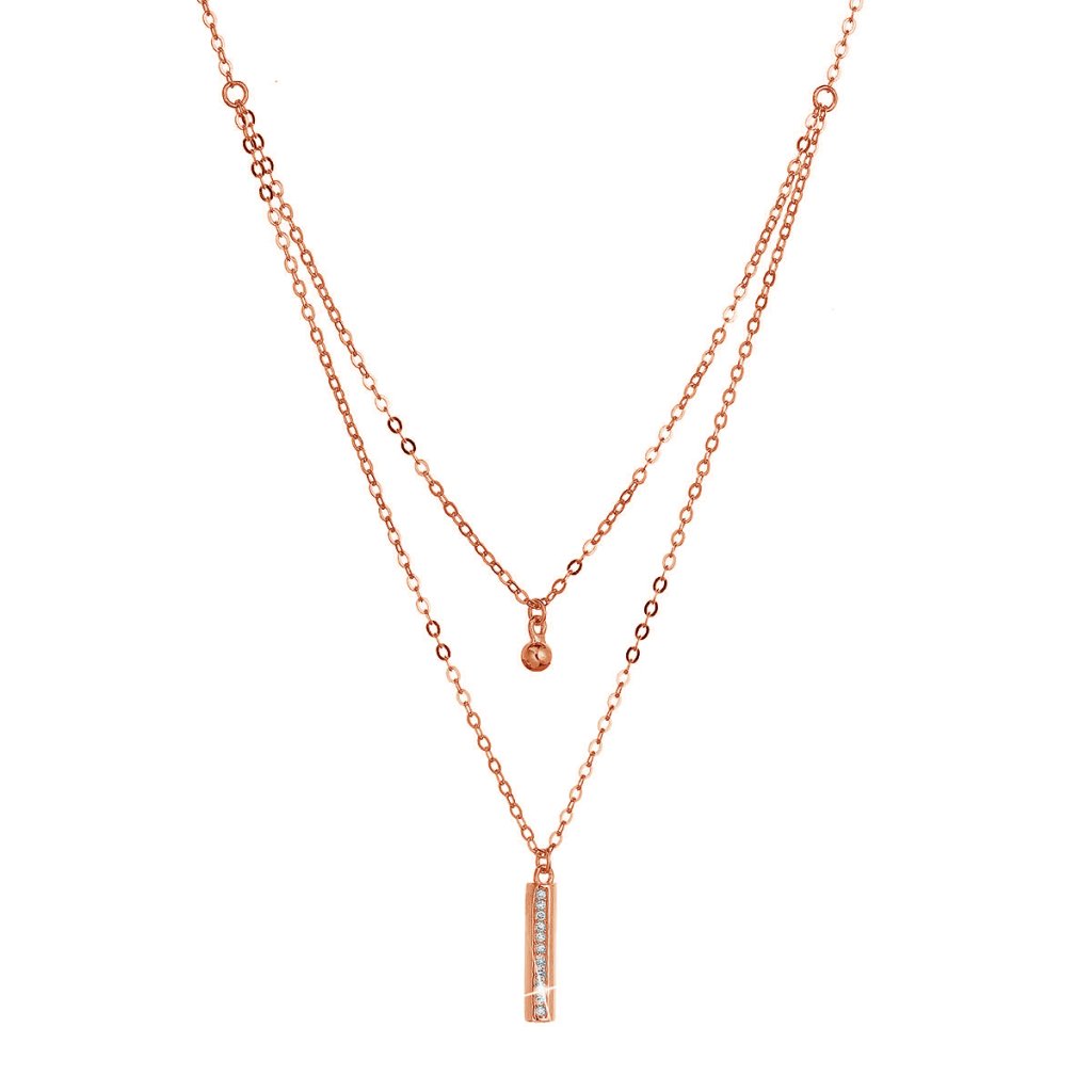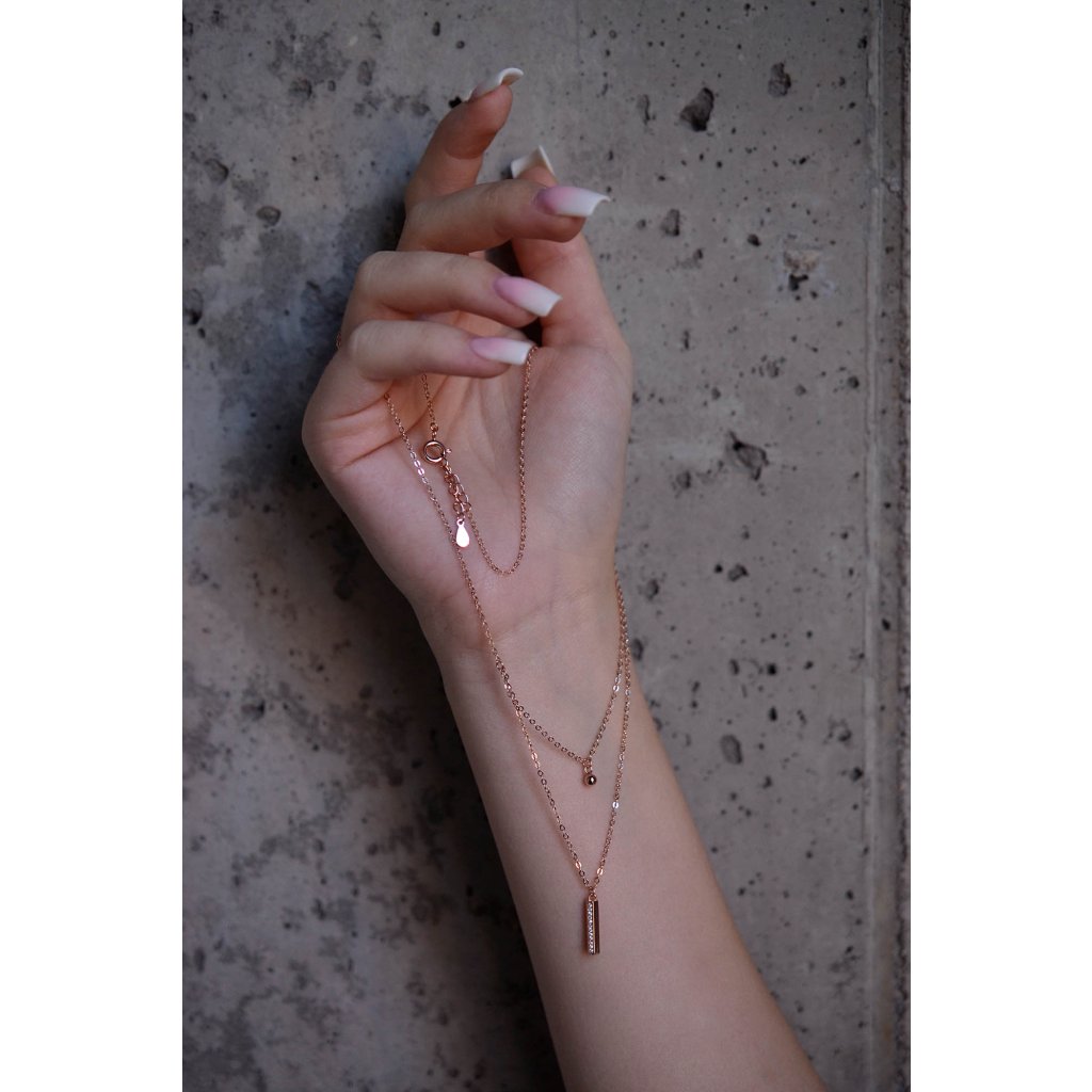 Originálny dvojradový náhrdelník , ktorým by ste mohli doplniť svoj každodenný outfit.Ružovo pozlátený strieborný náhrdelník s obdĺžnikom bohato vysadeným zirkónmi na jednej retiazke a na druhej gulička .