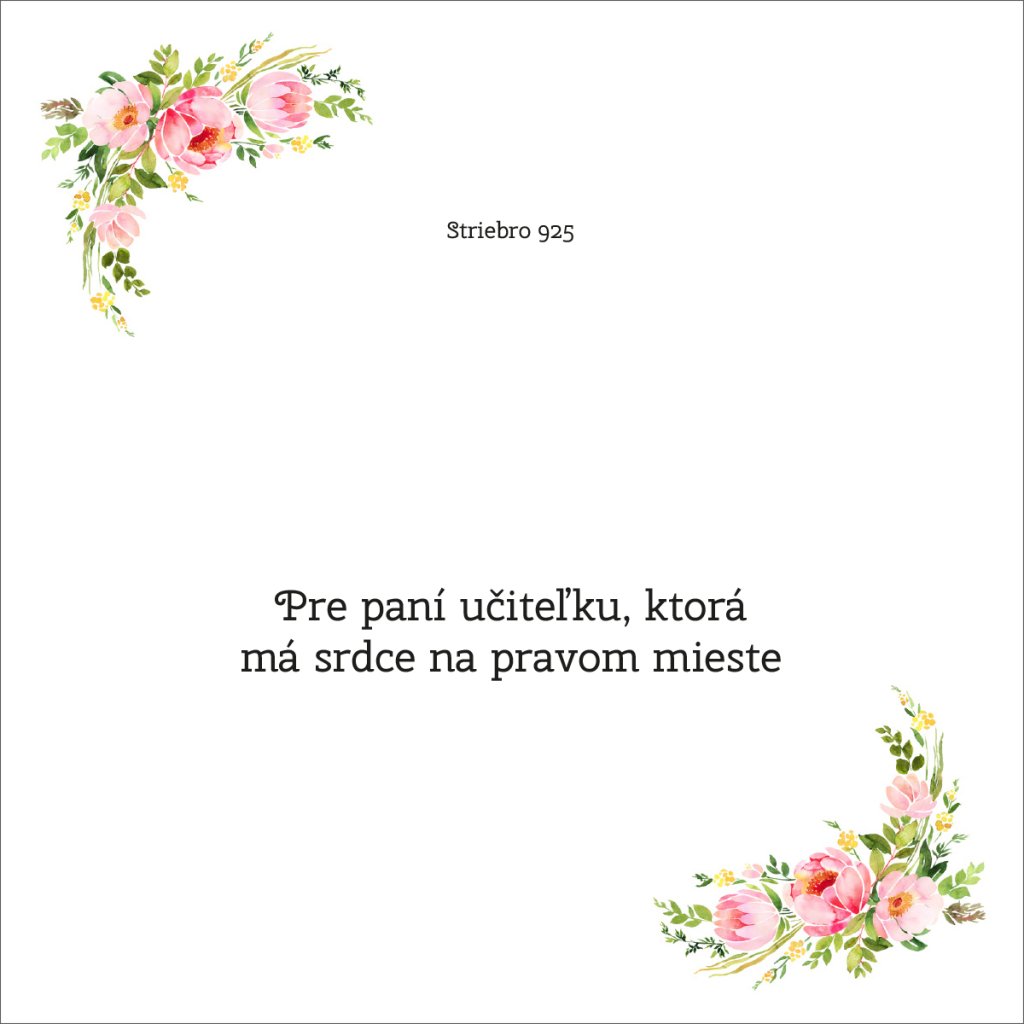 Darčekový set obsahuje strieborný náhrdelník srdiečko so zirkónikmi , ktorý je zavesený na darčekovej karte s nádherným prianím „Pre pani učiteľku, ktorá má srdce na pravom mieste“. Učiteľ je veľmi dôležitým človekom na ceste k dospelosti a nie je nič lepšie ako férová, milá a srdečná učiteľka. Srdce značí odvahu, statočnosť, ale hlavne vyjadruje vďaku žiakov za to, akú skvelú učiteľku majú.