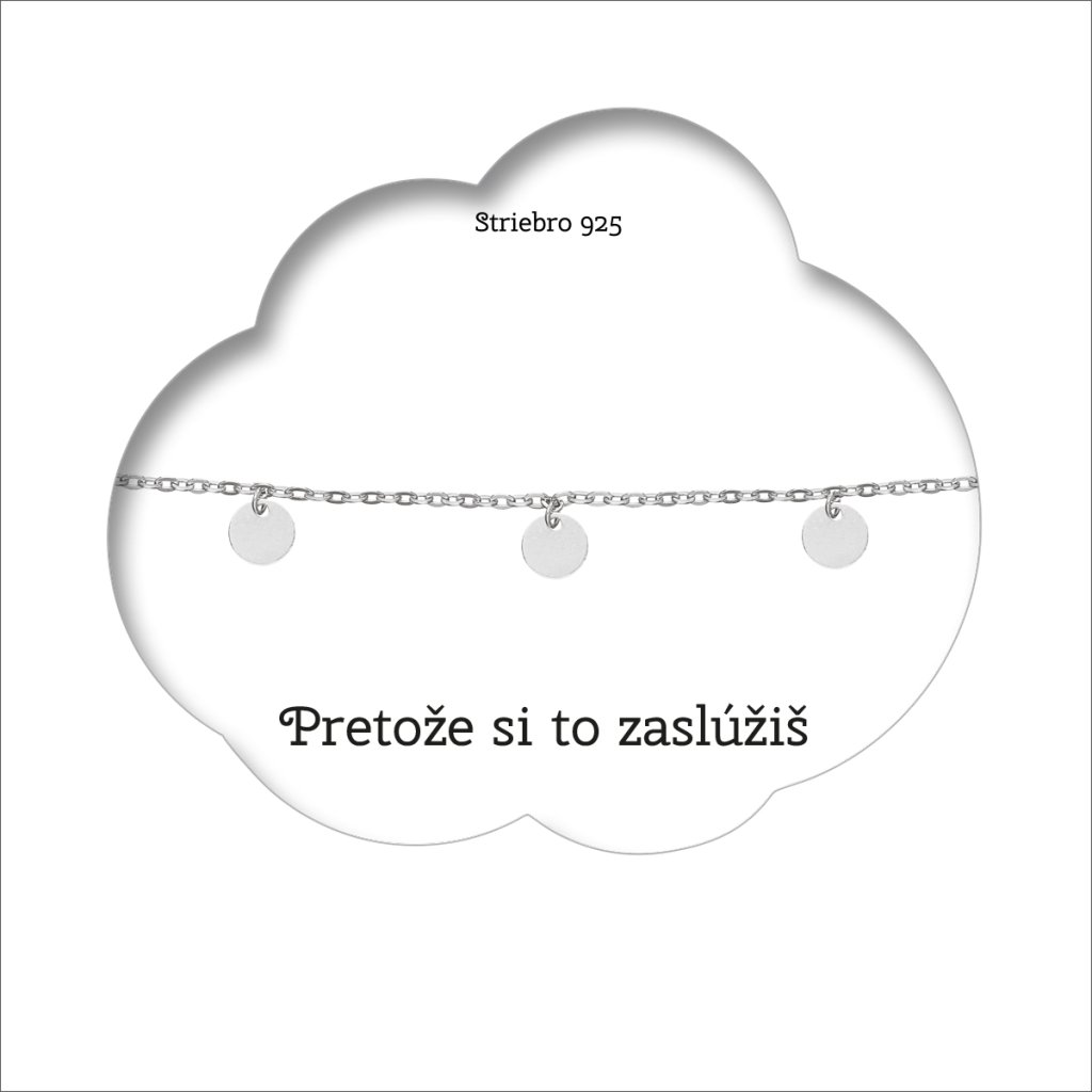 Darčekový set obsahuje strieborný náramok s placičkami dookola, zavesenými na retiazke , ktorý je zavesený na darčekovej karte s nádherným prianím „Pretože si to zaslúžiš“.