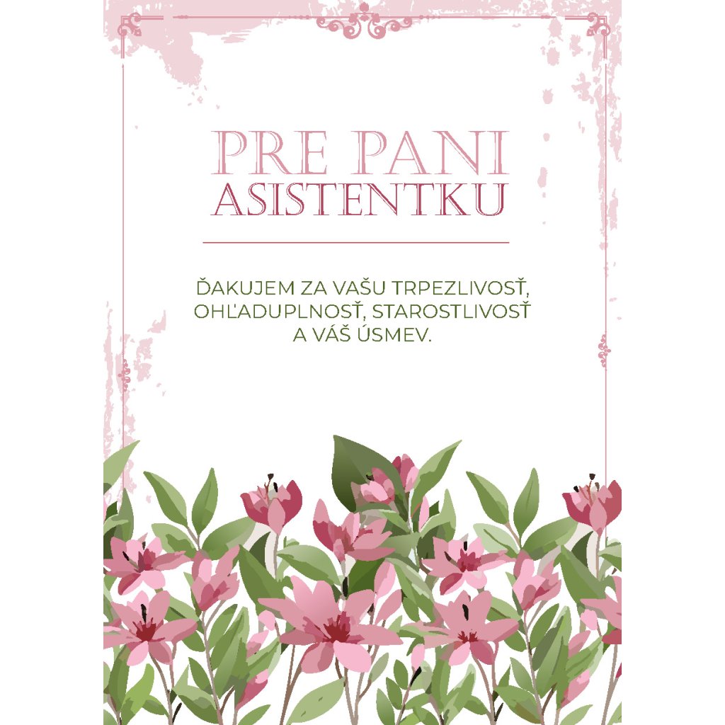 Krásna kartička s kvetinovým motívom a vrelým textom: "Pre pani asistentku. Ďakujem za Vašu trpezlivosť, starostlivosť, starostlivosť a za Váš úsmev."