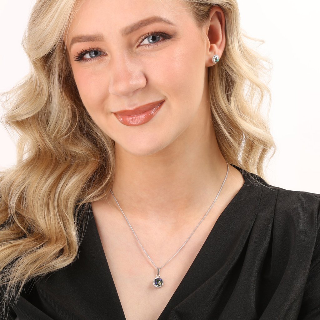 Ozdobte sa elegantnými a jednoduchými šperkami zo súpravy 39352.3, ktoré sa hodia k akémukoľvek outfitu.Sada 39352.5 obsahuje náušnice kôstky a retiazku s príveskom. Šperky sú vyrobené zo striebra rýdzosti 925/1000, ktoré prešlo povrchovou úpravou ródiom. Ródium chráni šperk proti sčerneniu, zožltnutiu i poškriabaniu. Prívesok aj náušnice sú zdobené okrúhlym zeleno-fialovým Swarovski kryštálom , ktorý je navyše olemovaný ešte malými trblietavými Swarovski kryštálmi v bielej farbe. Náušnice majú zapínanie na spoľahlivý balónik. Keďže šperky neobsahujú žiadny prídavok niklu , môžu ich bez obáv nosiť aj alergici.