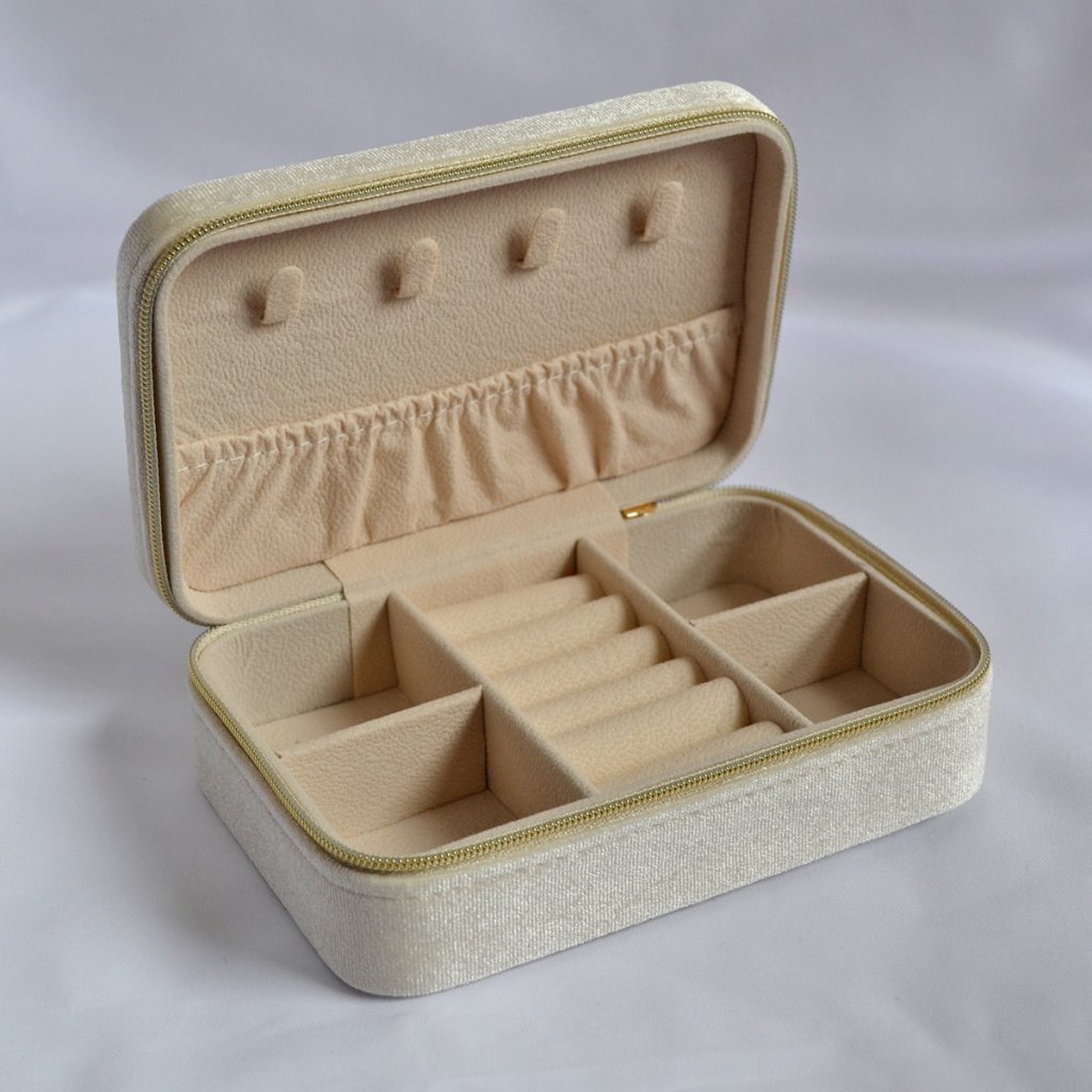 Obdĺžniková šperkovnica v jemnej béžovej farbe je ideálnym riešením pre bezpečné a štýlové uloženie vašich šperkov doma aj na cestách. Vďaka praktickým rozmerom 15 × 10,5 × 5 cm ponúka dostatok priestoru, a napriek tomu sa ľahko zmestí do kabelky, kufra či batohu.