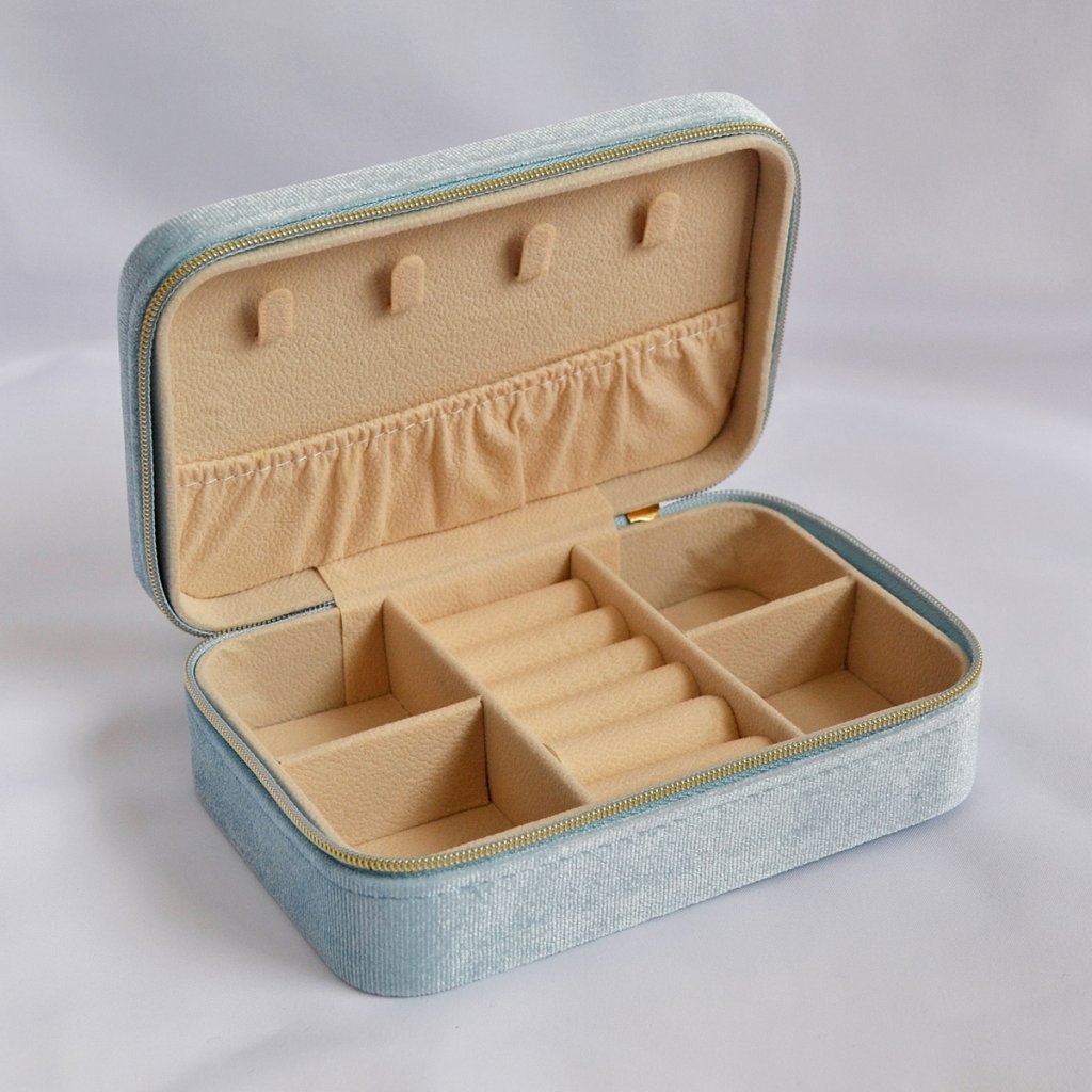 Elegantná a nadčasová – táto obdĺžniková šperkovnica v jemnej modrej farbe je ideálnym riešením pre bezpečné a štýlové uloženie vašich šperkov doma aj na cestách. Vďaka praktickým rozmerom 15 × 10,5 × 5 cm ponúka dostatok priestoru, a napriek tomu sa ľahko zmestí do kabelky, kufra či batohu.