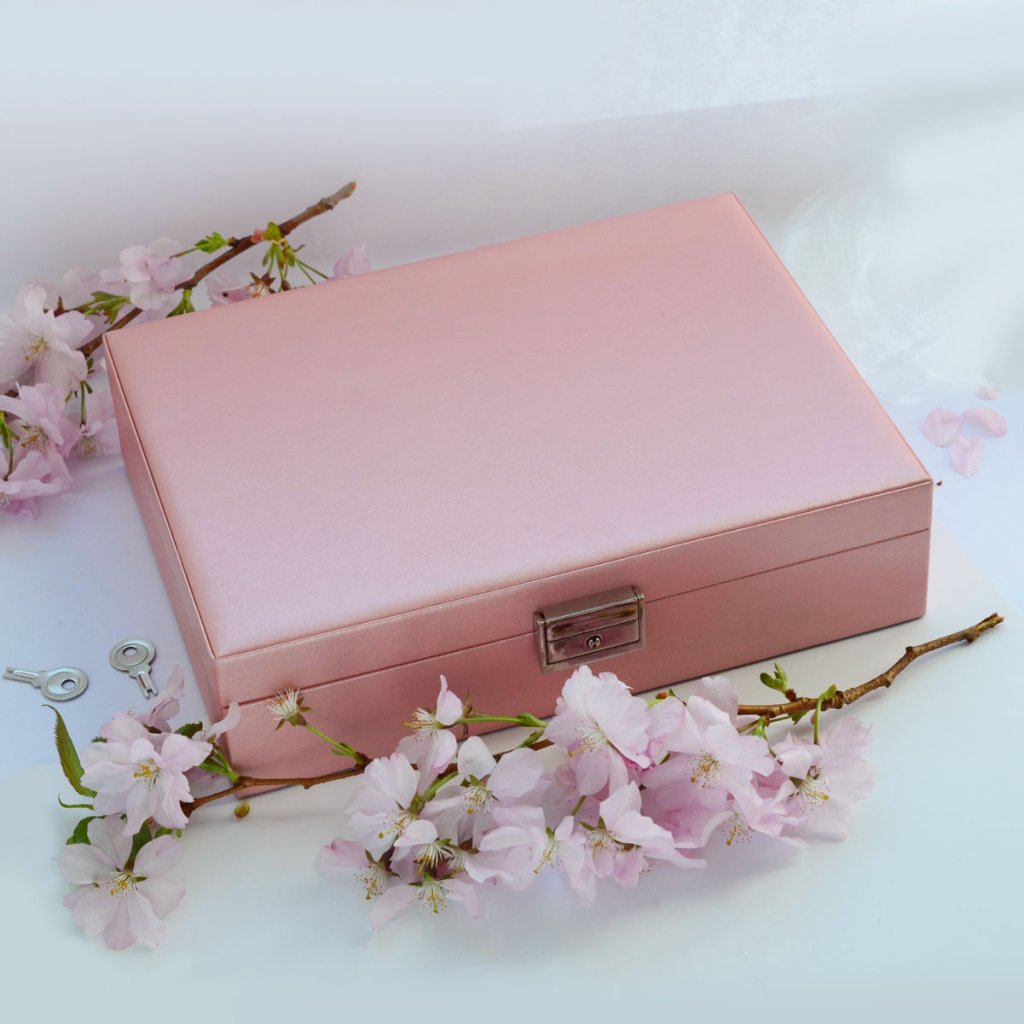 Veľká obdĺžniková šperkovnica II. akosti v jemnej ružovej farbe s hladkým povrchom je ideálnou voľbou pre všetkých, ktorí majú radi poriadok a štýl zároveň.