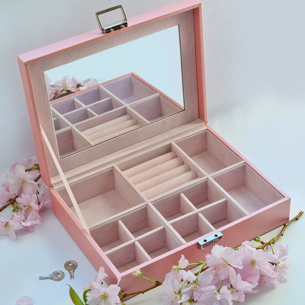 Veľká obdĺžniková šperkovnica v jemnej ružovej farbe s hladkým povrchom je ideálnou voľbou pre všetkých, ktorí majú radi poriadok a štýl zároveň.