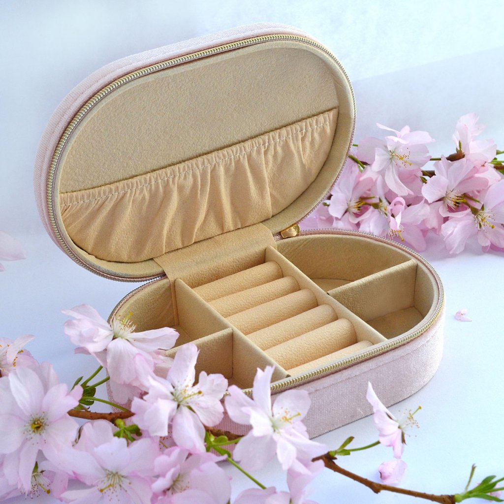 Šperkovnica II. akosti v oválnom tvare zaujme svojim hebkým zamatovým povrchom a decentným dizajnom, ktorý dodáva nádych luxusu.