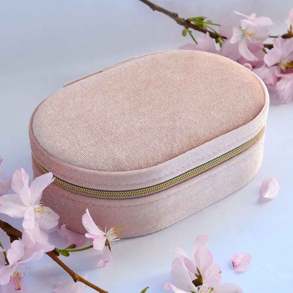 Elegantná šperkovnica v oválnom tvare zaujme svojim hebkým zamatovým povrchom a decentným dizajnom, ktorý dodáva nádych luxusu.