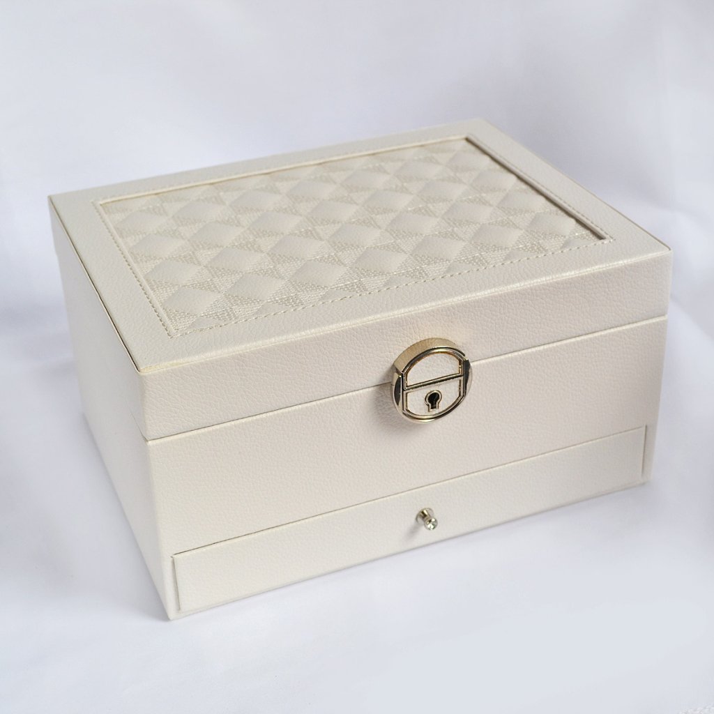 Elegantný koženkový povrch v bielej farbe je doplnený o štýlový šachovnicový vzor na vrchnom veku, ktorý dodáva šperkovnici moderný a sofistikovaný vzhľad. Po otvorení sa vám naskytne pohľad na bohato členený priestor a zrkadlo – ideálny na rýchle doladenie vzhľadu pred odchodom. Horné dve poschodia je možné bezpečne uzamknúť pomocou kovového zámku a priloženého kľúča , čo zaisťuje ochranu vašich pokladov. Spodný výsuvný šuplík zostáva voľne prístupný a ponúka ďalší praktický úložný priestor.