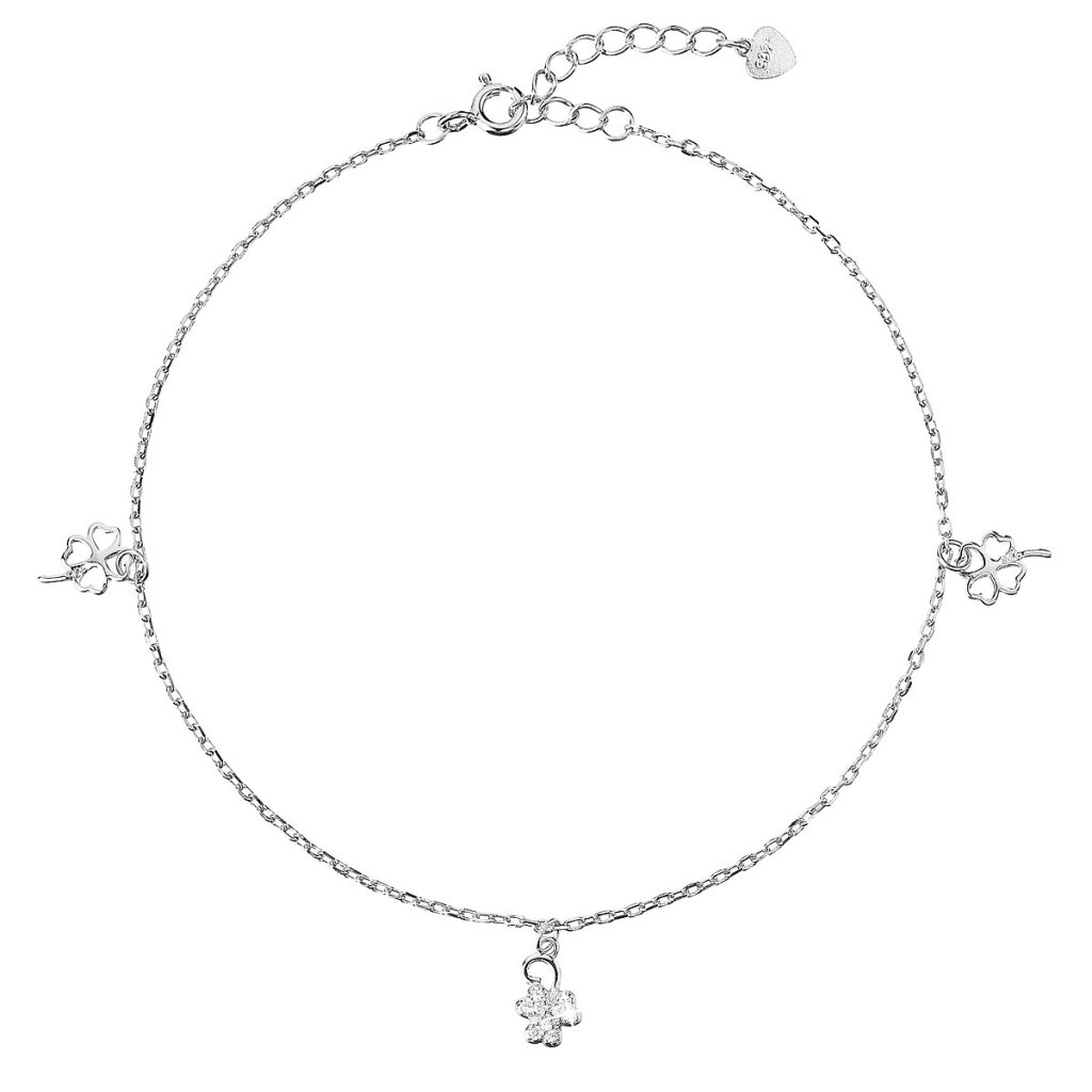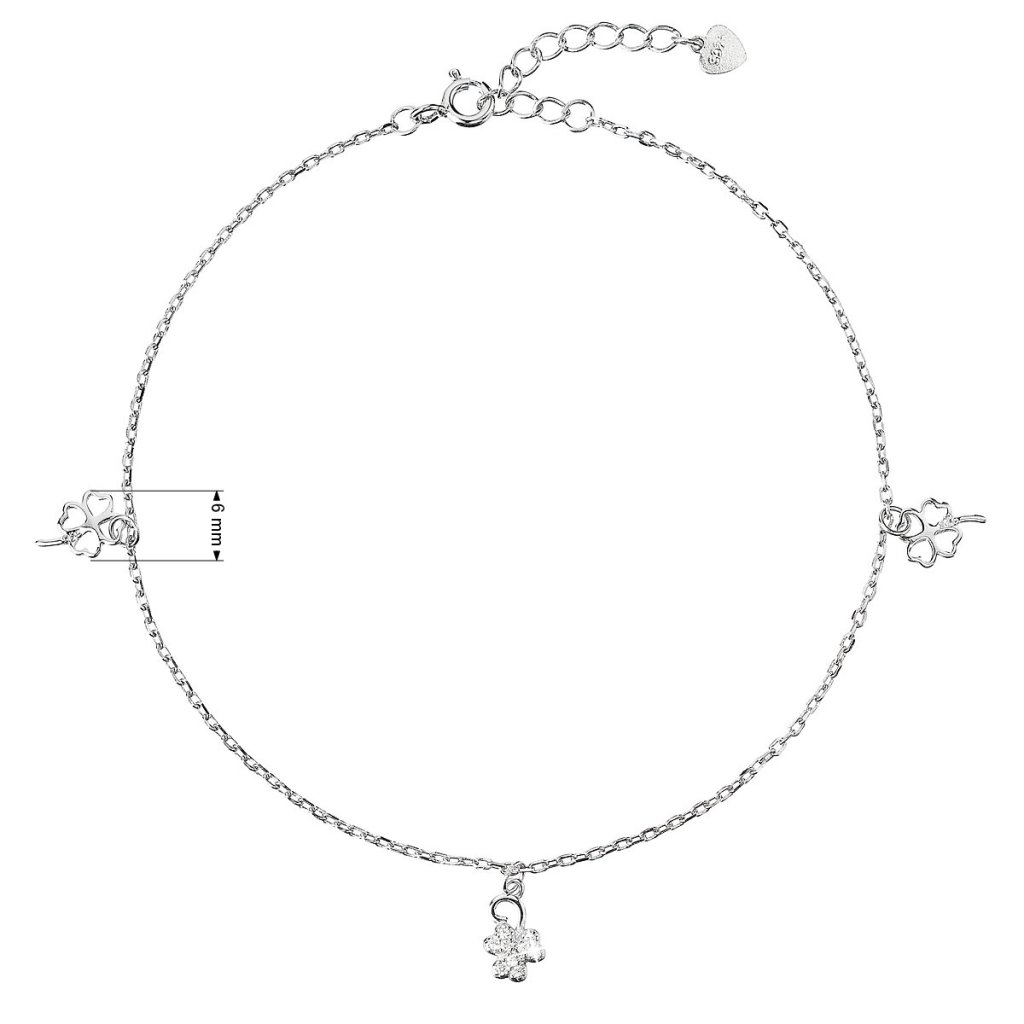Štýlová strieborná retiazka na nohu pre dokonalý vzhľad vašich nôh 16006.1, po obvode zdobená trojlístkom so zirkónmi a štvorlístkami je pre letné mesiace ideálny doplnok, ale využijete ho aj v čase plesovej sezóny.